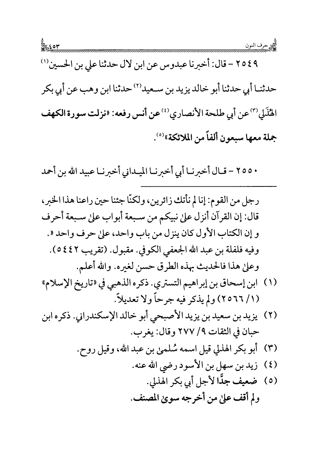 ٢٥٤٩ - قال: أخبرنا عبدوس عن ابن لال حدثنا علي بن الحسين (¬١) حدثنا أبي حدثنا أبو خالد يزيد بن سعيد (¬٢) حدثنا ابن وهب عن أبي بكر الهُذَلي (¬٣) عن أبي طلحة الأنصاري (¬٤) عن أنس رفعه: "نزلت سورة الكهف جملة معها سبعون ألفًا من الملائكة" (¬٥).