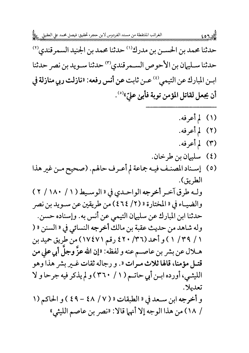 حدثنا محمد بن الحسن بن مدرك (¬١) حدثنا محمد بن الجنيد السمرقندي (¬٢) حدثنا سليمان بن الأحوص السمرقندي (¬٣) حدثنا سويد بن نصر حدثنا ابن المبارك عن التيمي (¬٤) عن ثابت عن أنس رفعه: "نازلت ربي منازلة في أن يجعل لقاتل المؤمن توبة فأبى عليّ" (¬٥).