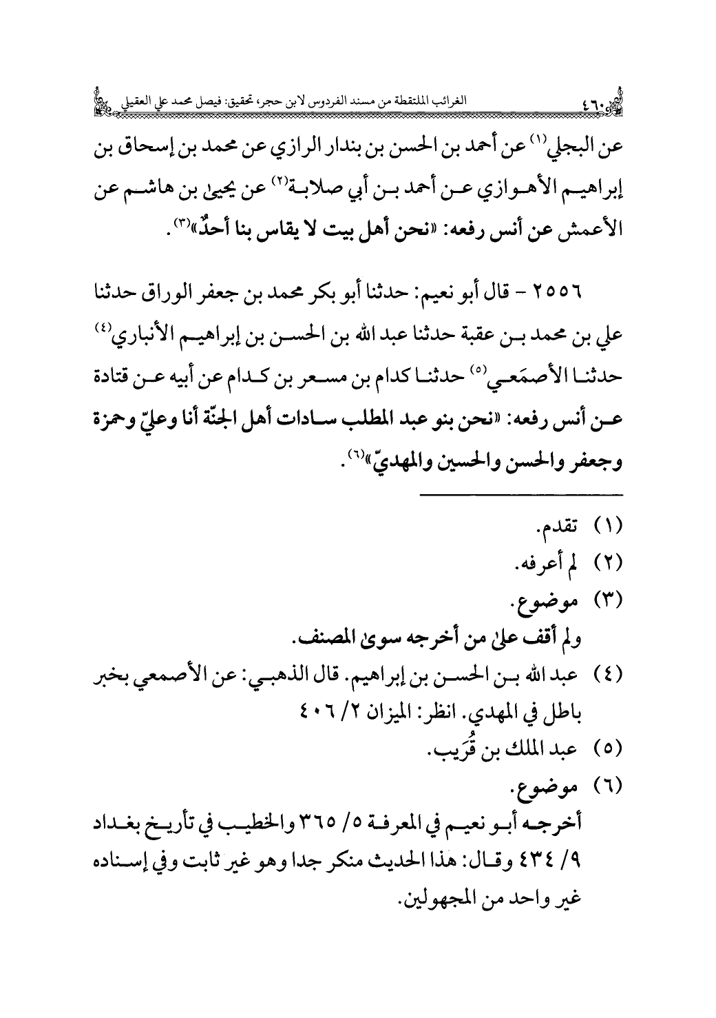 عن البجلي (¬١) عن أحمد بن الحسن بن بندار الرازي عن محمد بن إسحاق بن إبراهيم الأهوازي عن أحمد بن أبي صلابة (¬٢) عن يحيى بن هاشم عن الأعمش عن أنس رفعه: "نحن أهل بيت لا يقاس بنا أحدٌ" (¬٣).