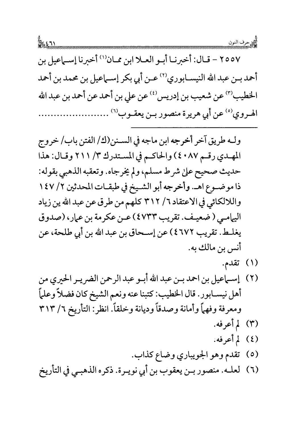 ٢٥٥٧ - قال: أخبرنا أبو العلا ابن ممان (¬١) أخبرنا إسماعيل بن أحمد بن عبد الله النيسابوري (¬٢) عن أبي بكر إسماعيل بن محمد بن أحمد الخطيب (¬٣) عن شعيب بن إدريس (¬٤) عن علي بن أحمد عن أحمد بن عبد الله الهروي (¬٥) عن أبي هريرة منصور بن يعقوب (¬٦) .......................