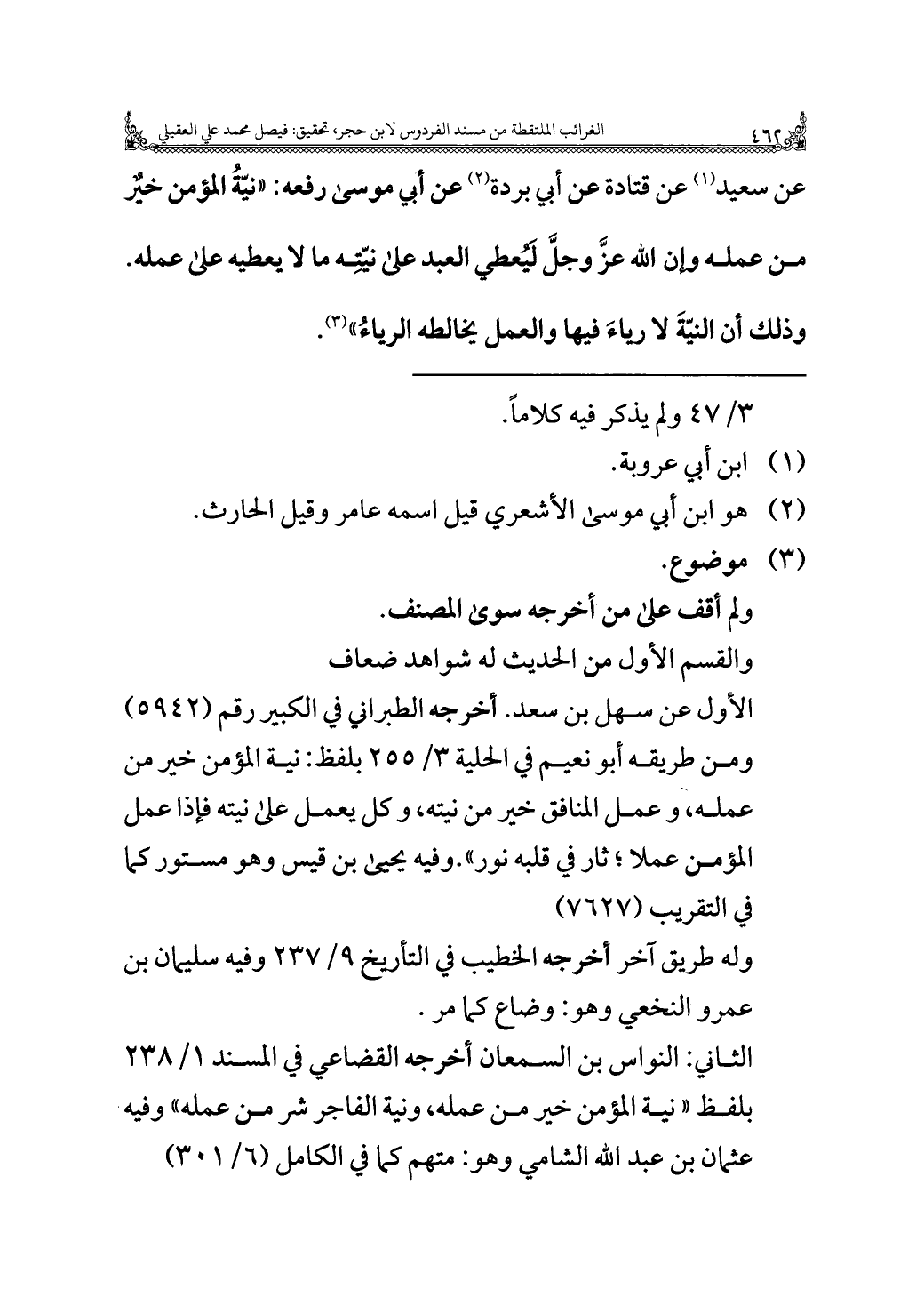 عن سعيد (¬١) عن قتادة عن أبي بردة (¬٢) عن أبي موسى رفعه: "نيّةُ المؤمن خيرٌ من عمله وإن الله عزَّ وجلَّ لَيُعطي العبد على نيّتِه ما لايعطيه على عمله. وذلك أن النيّةَ لا رياءَ فيها والعمل يخالطه الرياءُ" (¬٣).