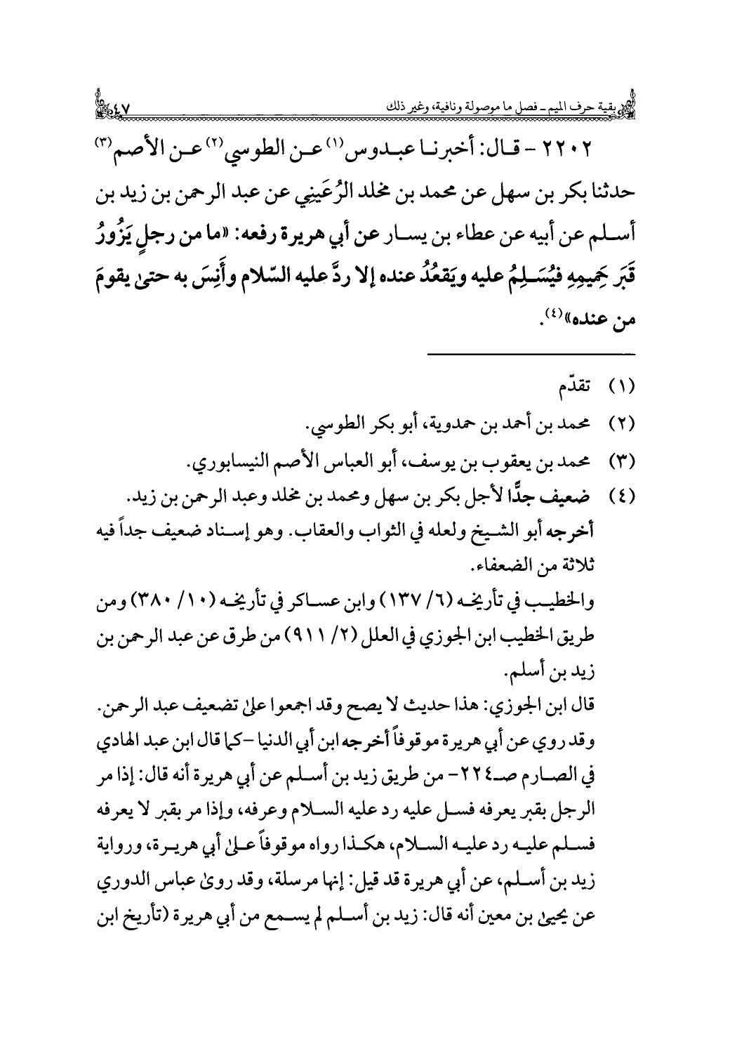٢٢٠٢ - قال: أخبرنا عبدوس (¬١) عن الطوسي (¬٢) عن الأصم (¬٣) حدثنا بكر بن سهل عن محمد بن مخلد الرُعَينِي عن عبد الرحمن بن زيد بن أسلم عن أبيه عن عطاء بن يسار عن أبي هريرة رفعه: "ما من رجلٍ يَزُورُ قَبَر حَميمِهِ فيُسَلِمُ عليه ويَقعُدُ عنده إلا ردَّ عليه السّلام وأَنِسَ به حتي يقومَ من عنده" (¬٤).