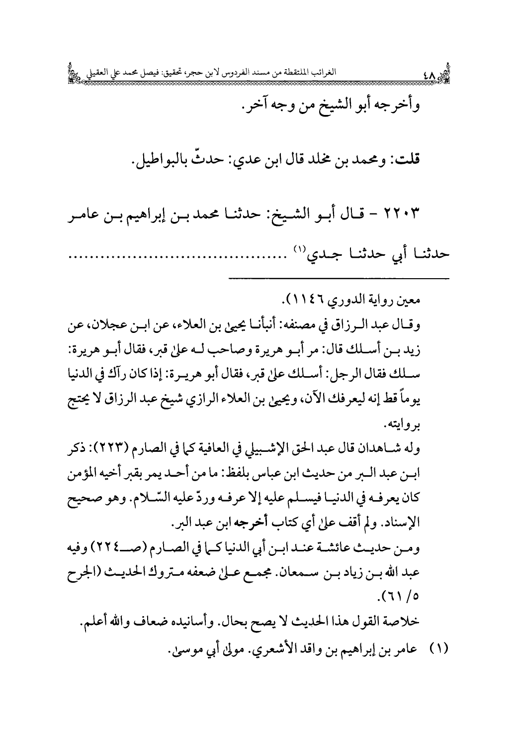وقال عبد الرزاق في مصنفه: أنبأنا يحيي بن العلاء، عن ابن عجلان، عن زيد بن أسلك قال: مر أبو هريرة وصاحب له علي قبر، فقال أبو هريرة: سلك فقال الرجل: أسلك علي قبر، فقال أبو هريرة: إذا كان رآك في الدنيا يومًا قط إنه ليعرفك الآن، ويحيي بن العلاء الرازي شيخ عبد الرزاق لا يحتج بروايته.