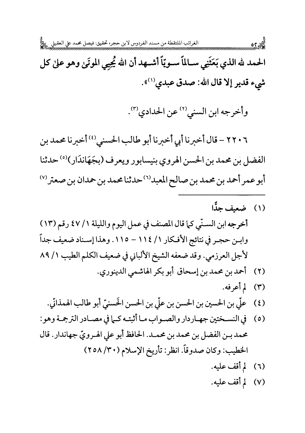 ٢٢٠٦ - قال أخبرنا أبي أخبرنا أبو طالب الحسني (¬٤) أخبرنا محمد بن الفضل بن محمد بن الحسن الهروي بنيسابور ويعرف (بجَهَاندَار) (¬٥) حدثنا أبو عمر أحمد بن محمد بن صالح المعبد (¬٦) حدثنا محمد بن حمدان بن صعتر (¬٧)