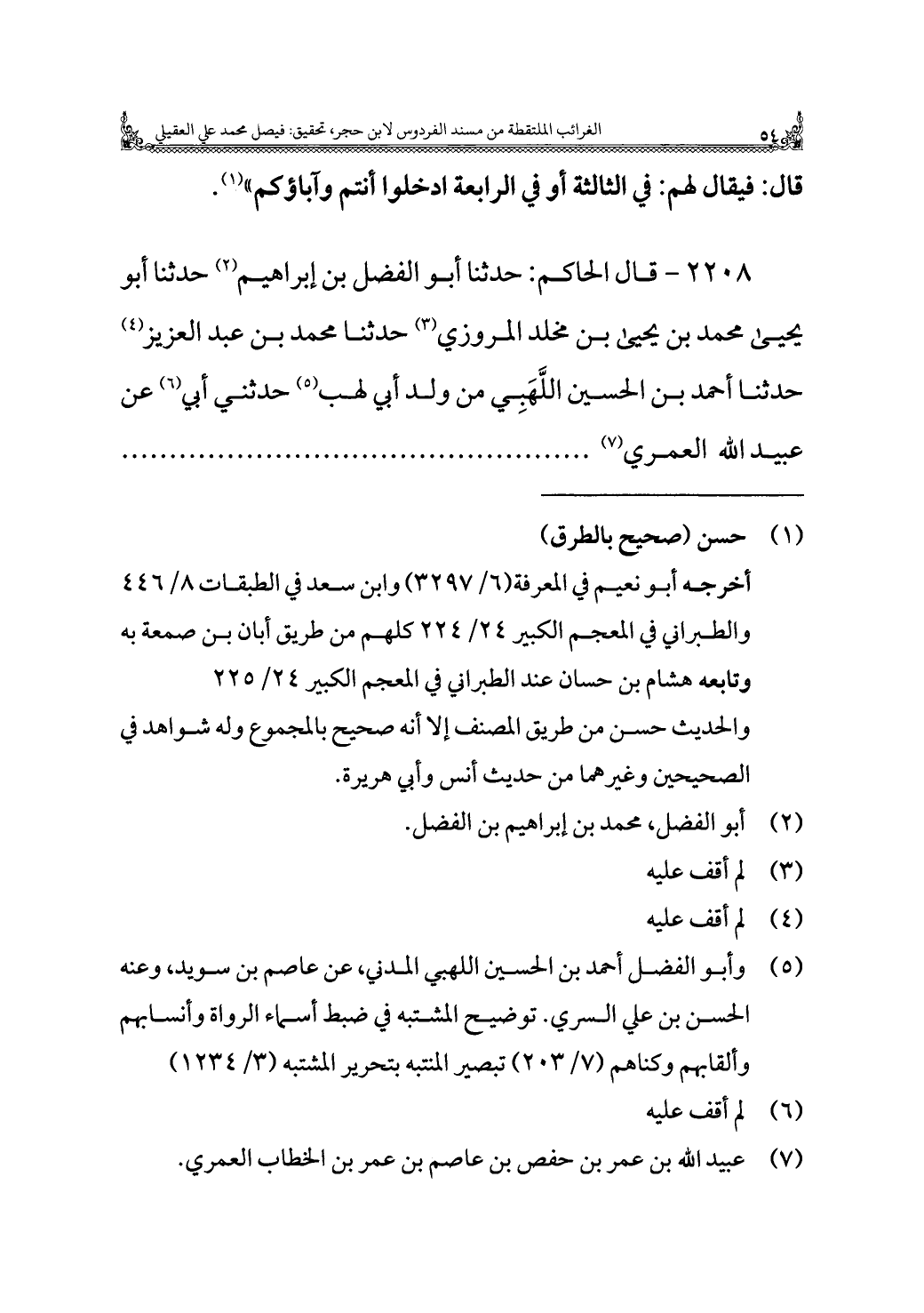 ٢٢٠٨ - قال الحاكم: حدثنا أبو الفضل بن إبراهيم (¬٢) حدثنا أبو يحيي محمد بن يحيي بن مخلد المروزي (¬٣) حدثنا محمد بن عبد العزيز (¬٤) حدثنا أحمد بن الحسين اللَّهَبِي من ولد أبي لهب (¬٥) حدثني أبي (¬٦) عن عبيد الله العمري (¬٧) .................................................