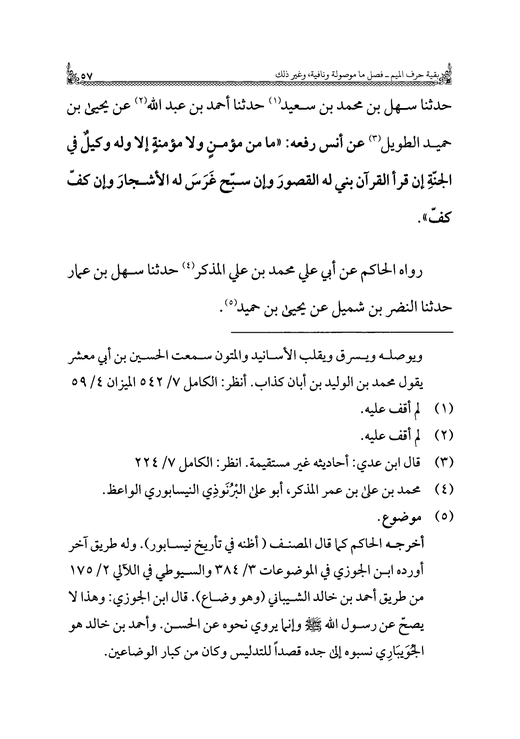 حدثنا سهل بن محمد بن سعيد (¬١) حدثنا أحمد بن عبد الله (¬٢) عن يحيي بن حميد الطويل (¬٣) عن أنس رفعه: "ما من مؤمنٍ ولا مؤمنةٍ إلا وله وكيل في الجنّةِ إن قرأ القرآن بني له القصورَ وإن سبّح كَرَسَ له الأشجارَ وإن كفّ كفّ".
