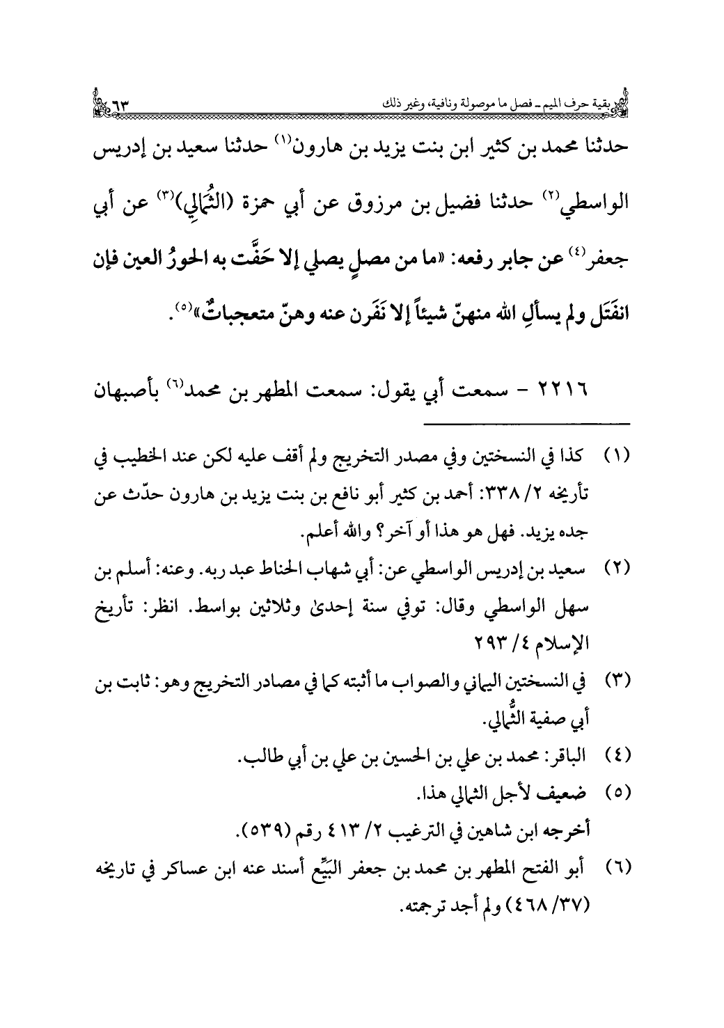 حدثنا محمد بن كثير ابن بنت يزيد بن هارون (¬١) حدثنا سعيد بن إدريس الواسطي (¬٢) حدثنا فضيل بن مرزوق عن أبي حمزة (الثُمَالِي) (¬٣) عن أبي جعفر (¬٤) عن جابر رفعه: "ما من مصلٍ يصلي إلَّا حَفَّت به الحورُ العين فإن انفَتَل ولم يسألِ الله منهنّ شيئًا إلَّا نَفَرن عنه وهنّ متعجباتٌ" (¬٥).