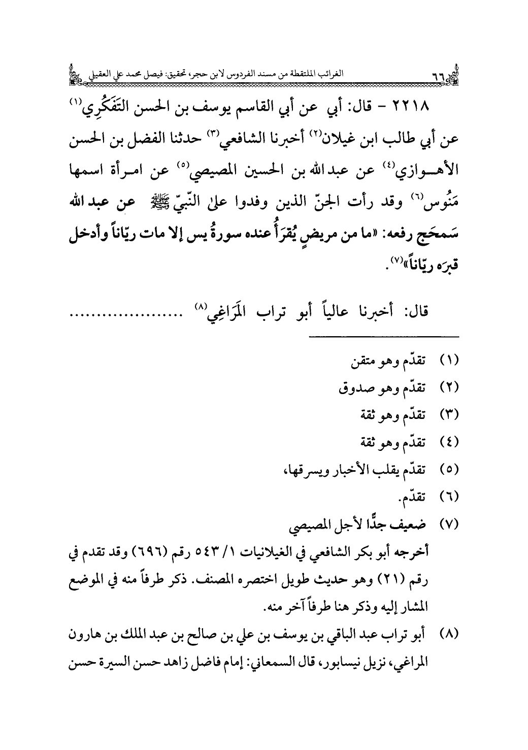 ٢٢١٨ - قال: أبي عن أبي القاسم يوسف بن الحسن التَفَكُرِي (¬١) عن أبي طالب ابن غيلان (¬٢) أَخْبَرَنَا الشافعي (¬٣) حدثنا الفضل بن الحسن الأهوازي (¬٤) عن عبد الله بن الحسين المصيصي (¬٥) عن امرأة اسمها مَنُوس (¬٦) وقد رأت الجنّ الذين وفدوا على النّبيّ -صَلَّى اللهُ عَلَيْهِ وَسَلَّمَ- عن عبد الله سَمحَج رفعه: "ما من مريضٍ يُقرَأُ عنده سورةُ يس إلَّا مات ريّانًا وأدخل قبرَه ريَّانًا" (¬٧).