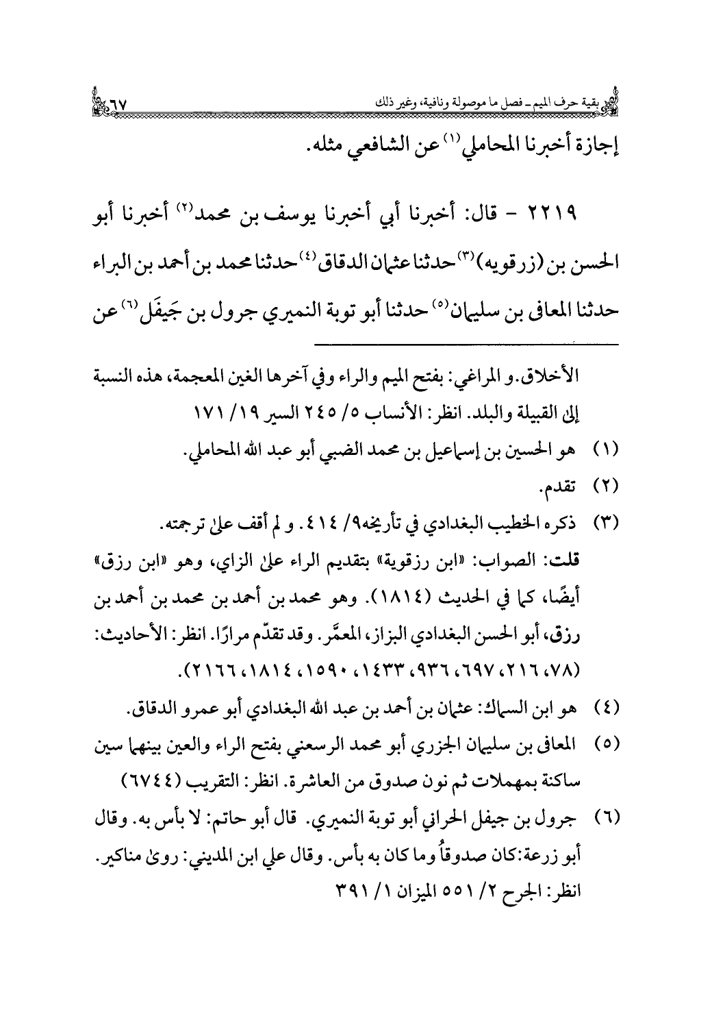 (¬٥) المعافى بن سليمان الجزري أبو محمد الرسعني بفتح الراء والعين بينهما سين ساكنة بمهملات ثم نون صدوق من العاشرة. انظر: التقريب (٦٧٤٤)