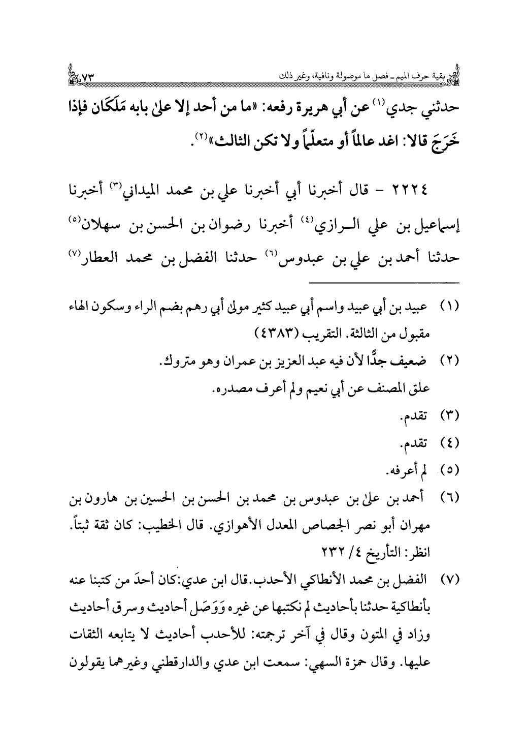 ٢٢٢٤ - قال أَخْبَرَنَا أبي أَخْبَرَنَا علي بن محمد الميداني (¬٣) أَخْبَرَنَا إسماعيل بن علي الرازي (¬٤) أَخْبَرَنَا رضوان بن الحسن بن سهلان (¬٥) حدثنا أحمد بن علي بن عبدوس (¬٦) حدثنا الفضل بن محمد العطار (¬٧)