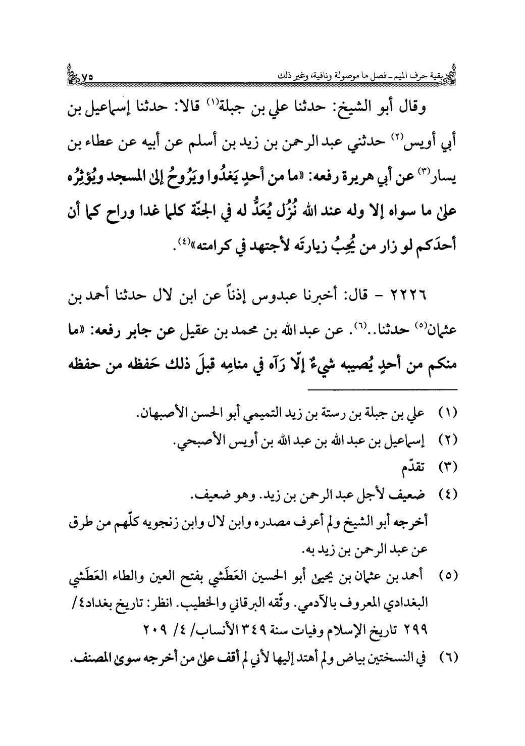 وقال أبو الشيخ: حدثنا علي بن جبلة (¬١) قالا: حدثنا إسماعيل بن أبي أويس (¬٢) حدّثني عبد الرَّحمن بن زيد بن أسلم عن أبيه عن عطاء بن يسار (¬٣) عن أبي هريرة رفعه: "ما من أحدٍ يَغدُوا ويَرُوحُ إلى المسجد ويُؤثرُه على ما سواه إلَّا وله عند الله نُزُل يُعَدُّ له في الجنّة كلما غدا وراح كما أن أحدَكم لو زار من يُحِبُ زيارتَه لأجتهد في كرامته" (¬٤).