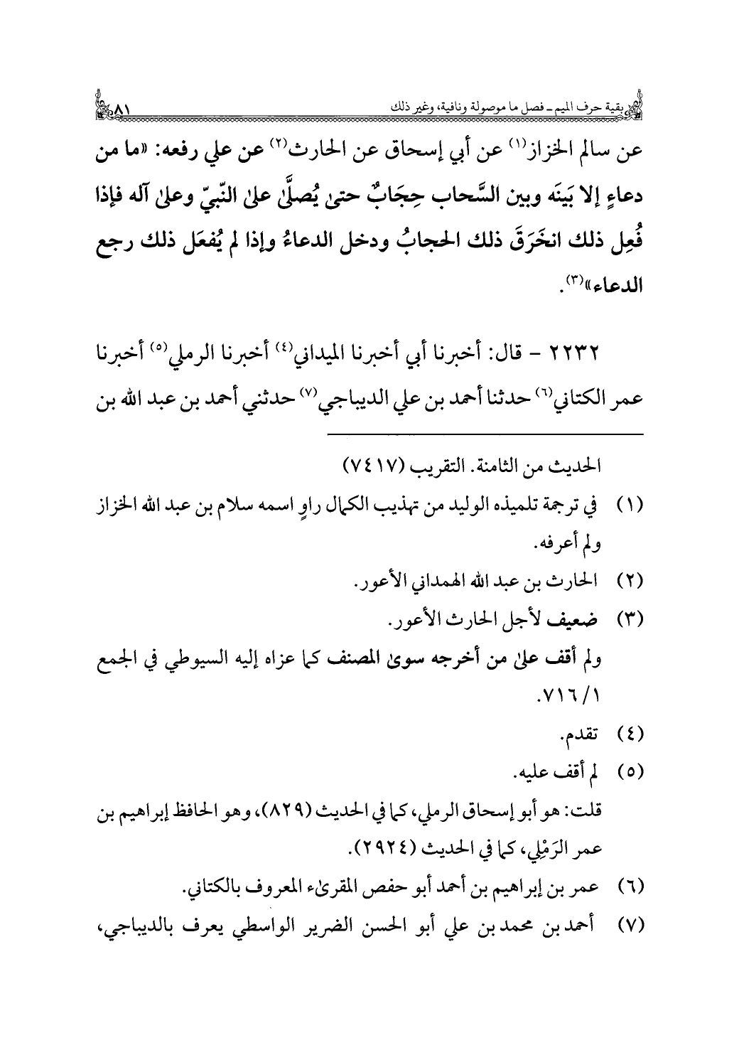 عن سالم الخزاز (¬١) عن أبي إسحاق عن الحارث (¬٢) عن علي رفعه: "ما من دعا إلَّا بَينَه وبين السَّحاب حِجَابٌ حَتَّى يُصلَّى على النّبيّ وعلى آله فإذا فُعِل ذلك انخَرَقَ ذلك الحجابُ ودخل الدعاءُ وإذا لم يُفعَل ذلك رجع الدعاء" (¬٣).