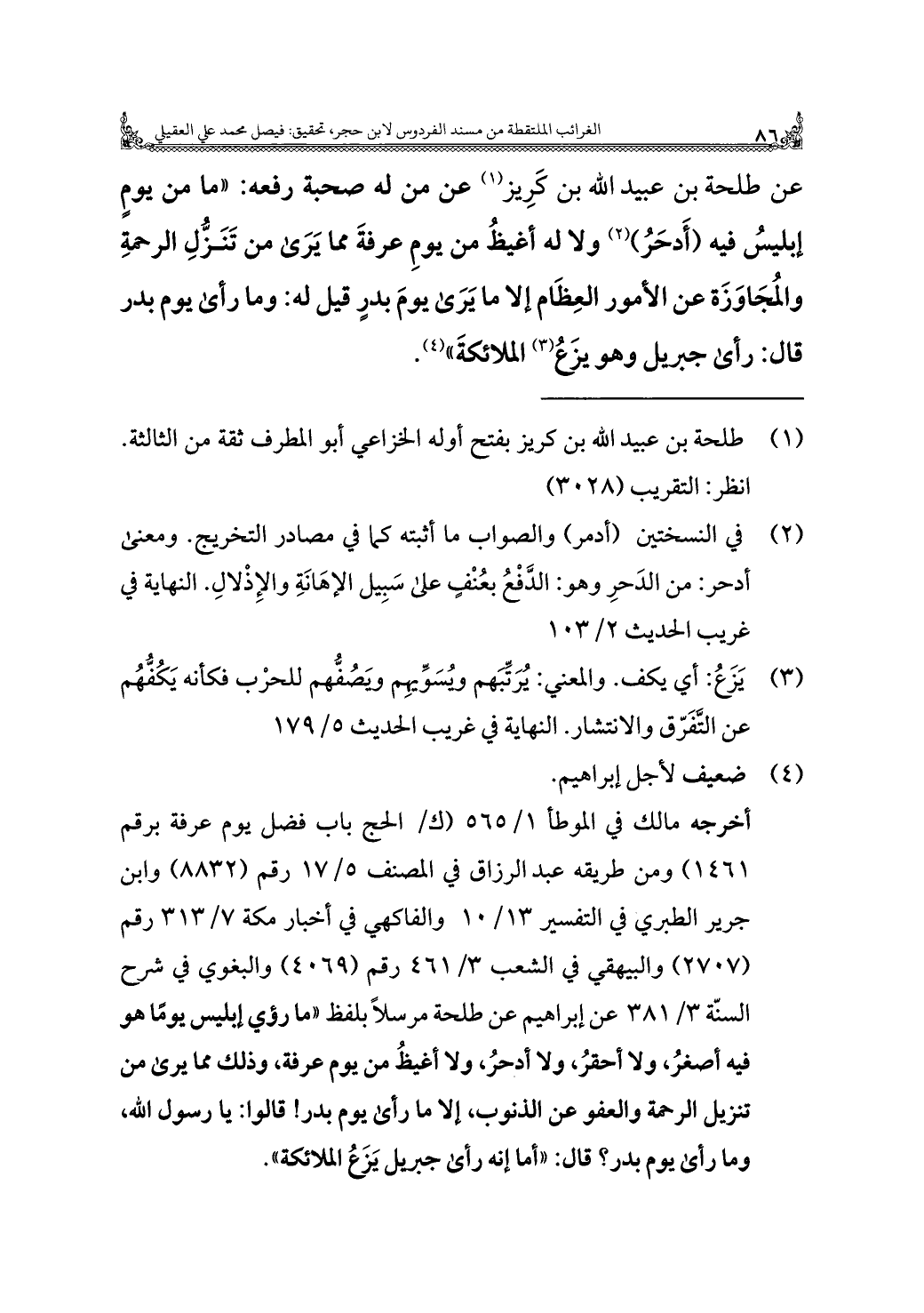 أخرجه مالك في الموطأ ١/ ٥٦٥ (ك/ الحجِّ باب فضل يوم عرفة برقم ١٤٦١) ومن طريقه عبد الرزَّاق في المصنّف ٥/ ١٧ رقم (٨٨٣٢) وابن جرير الطبري في التفسير ١٣/ ١٠ والفاكهي في أخبار مكة ٧/ ٣١٣ رقم (٢٧٠٧) والبيهقي في الشعب ٣/ ٤٦١ رقم (٤٠٦٩) والبغوي في شرح السنّة ٣/ ٣٨١ عن إبراهيم عن طلحة مرسلًا بلفظ "ما رؤي إبليس يومًا هو فيه أصغرُ، ولا أحقرُ، ولا أدحرُ، ولا أغيظُ من يوم عرفة، وذلك مِمَّا يرى من تنزيل الرحمة والعفو عن الذنوب، إلَّا ما رأى يوم بدر! قالوا: يا رسول الله، وما رأى يوم بدر؟ قال: "أما إنه رأى جبريل يَزَعُ الملائكة".