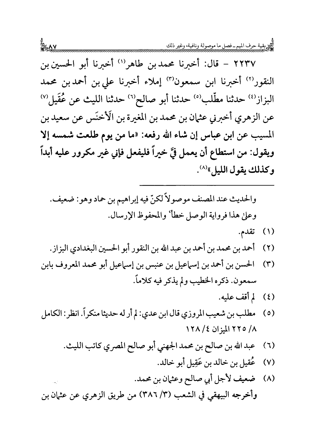 ٢٢٣٧ - قال: أَخْبَرَنَا محمد بن طاهر (¬١) أَخْبَرَنَا أبو الحسين بن النقور (¬٢) أَخْبَرَنَا ابن سمعون (¬٣) إملاء أَخْبَرَنَا علي بن أحمد بن محمد البزاز (¬٤) حدثنا مطّلب (¬٥) حدثنا أبو صالح (¬٦) حدثنا الليث عن عُقَيل (¬٧) عن الزهري أخبرني عثمان بن محمد بن المغيرة بن الأَخنَس عن سعيد بن المسيب عن ابن عَبَّاس إن شاء الله رفعه: "ما من يوم طلعت شمسه إلَّا ويقول: من استطاع أن يعمل فيَّ خيرًا فليفعل فإني غير مكرور عليه أبدًا وكذلك يقول الليل" (¬٨).