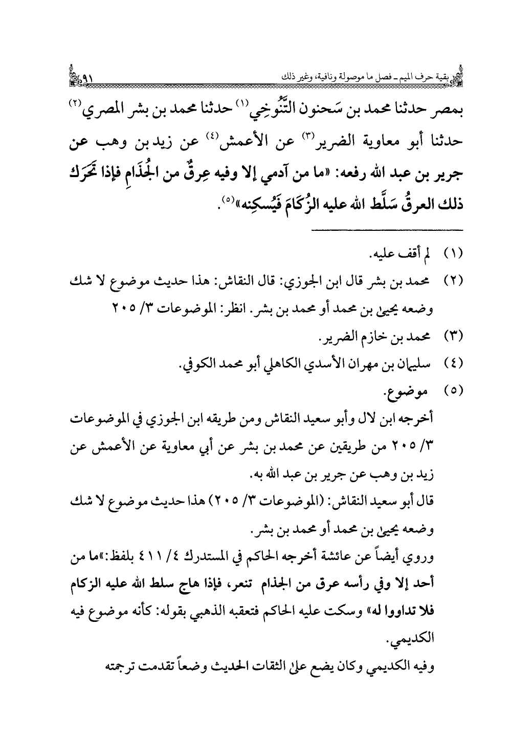 بمصر حدثنا محمد بن سَحنون التَّنُوخِي (¬١) حدثنا محمد بن بشر المصري (¬٢) حدثنا أبو معاوية الضرير (¬٣) عن الأعمش (¬٤) عن زيد بن وهب عن جرير بن عبد الله رفعه: "ما من آدمي إلَّا وفيه عِرقٌ من الجُذَامِ فإذا تَحَرَك ذلك العرقُ سَلَّط الله عليه الزُكَامَ فَيُسكِنه" (¬٥).
