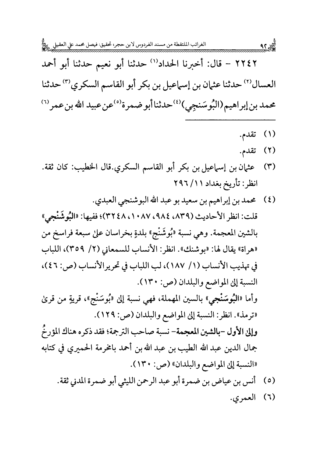 ٢٢٤٢ - قال: أَخْبَرَنَا الحداد (¬١) حدثنا أبو نعيم حدثنا أبو أحمد العسال (¬٢) حدثنا عثمان بن إسماعيل بن بكر أبو القاسم السكري (¬٣) حدثنا بن إبراهيم (البُوسَنجِي) (¬٤) حدثنا أبو ضمرة (¬٥) عن عبيد الله بن عمر (¬٦)