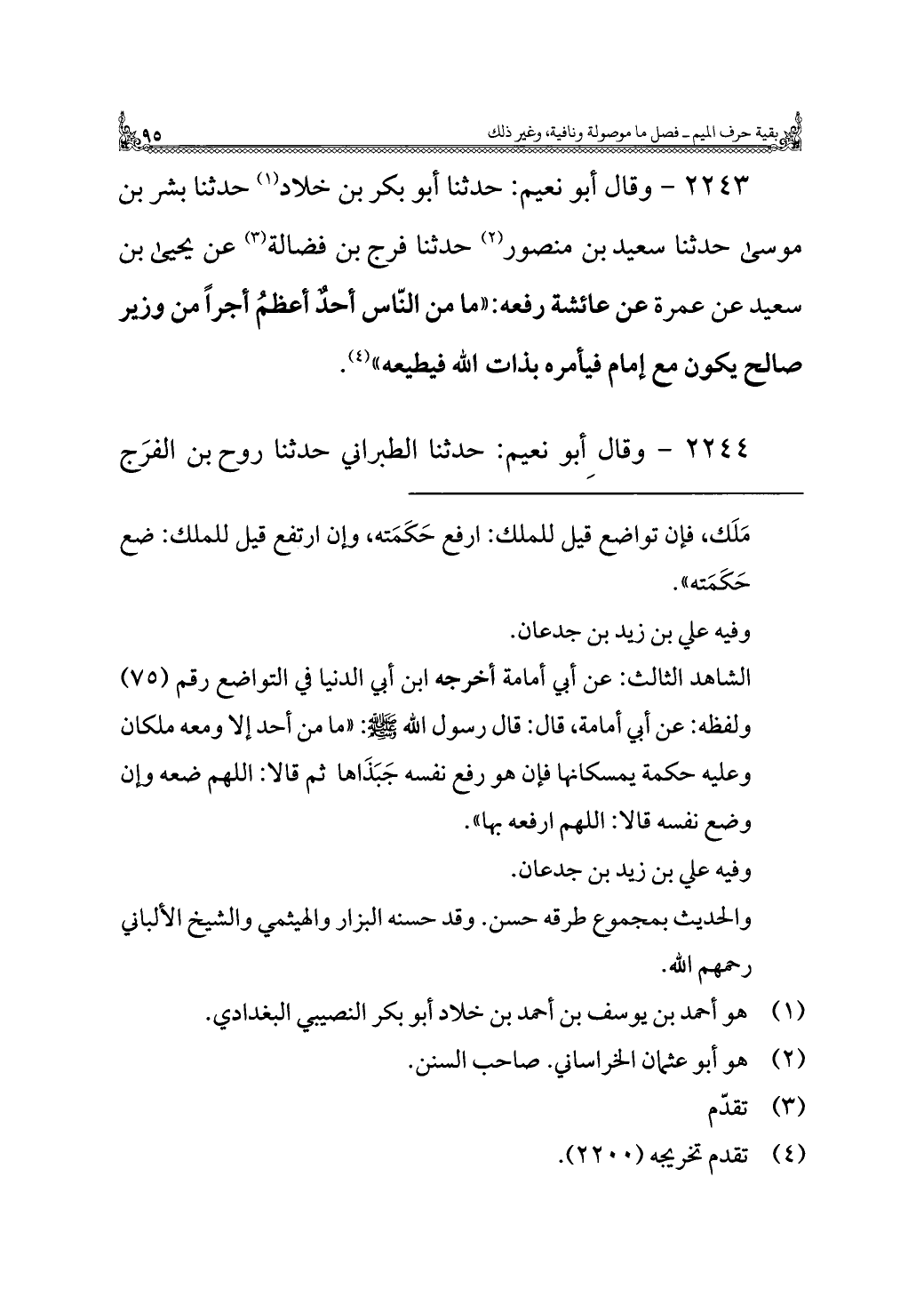 ٢٢٤٣ - وقال أبو نعيم: حدثنا أبو بكر بن خلاد (¬١) حدثنا بشر بن موسى حدثنا سعيد بن منصور (¬٢) حدثنا فرج بن فضالة (¬٣) عن يحيى بن سعيد عن عمرة عن عائشة رفعه: "ما من النّاس أحدٌ أعظمُ أجرًا من وزير صالح يكون مع إمام فيأمره بذات الله فيطيعه" (¬٤).
