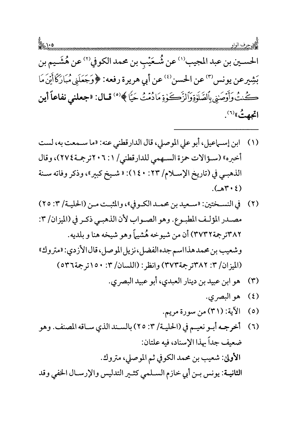 الحسين بن عبد المجيب (¬١) عن شُعَيْبِ بن محمد الكوفي (¬٢) عن هُشَيم بن بَشِير عن يونس (¬٣) عن الحسن (¬٤) عن أبي هريرة رفعه: {وَجَعَلَنِي مُبَارَكًا أَيْنَ مَا كُنْتُ وَأَوْصَانِي بِالصَّلَاةِ وَالزَّكَاةِ مَا دُمْتُ حَيًّا} (¬٥) قال: "جعلني نفاعًا أين اتجهتُ" (¬٦).