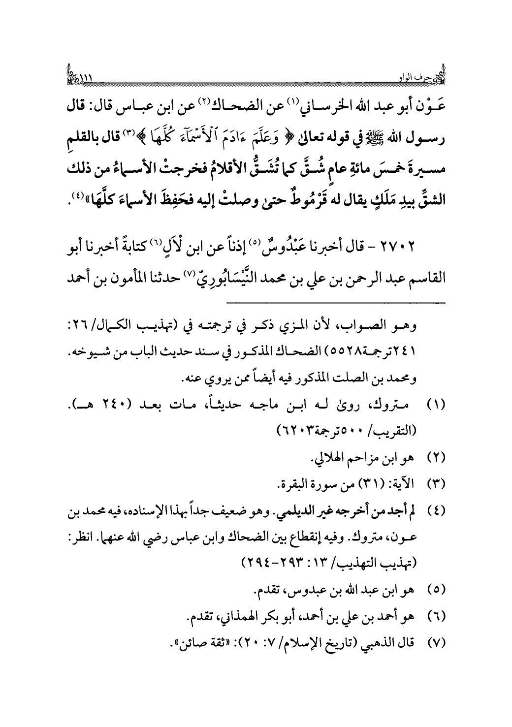 ٢٧٠٢ - قال أخبرنا عَبْدُوسٌ (¬٥) إذنًا عن ابن لْاَلٍ (¬٦) كتابةً أخبرنا أبو القاسم عبد الرحمن بن علي بن محمد النَّيْسَابُورِيّ (¬٧) حدثنا المأمون بن أحمد