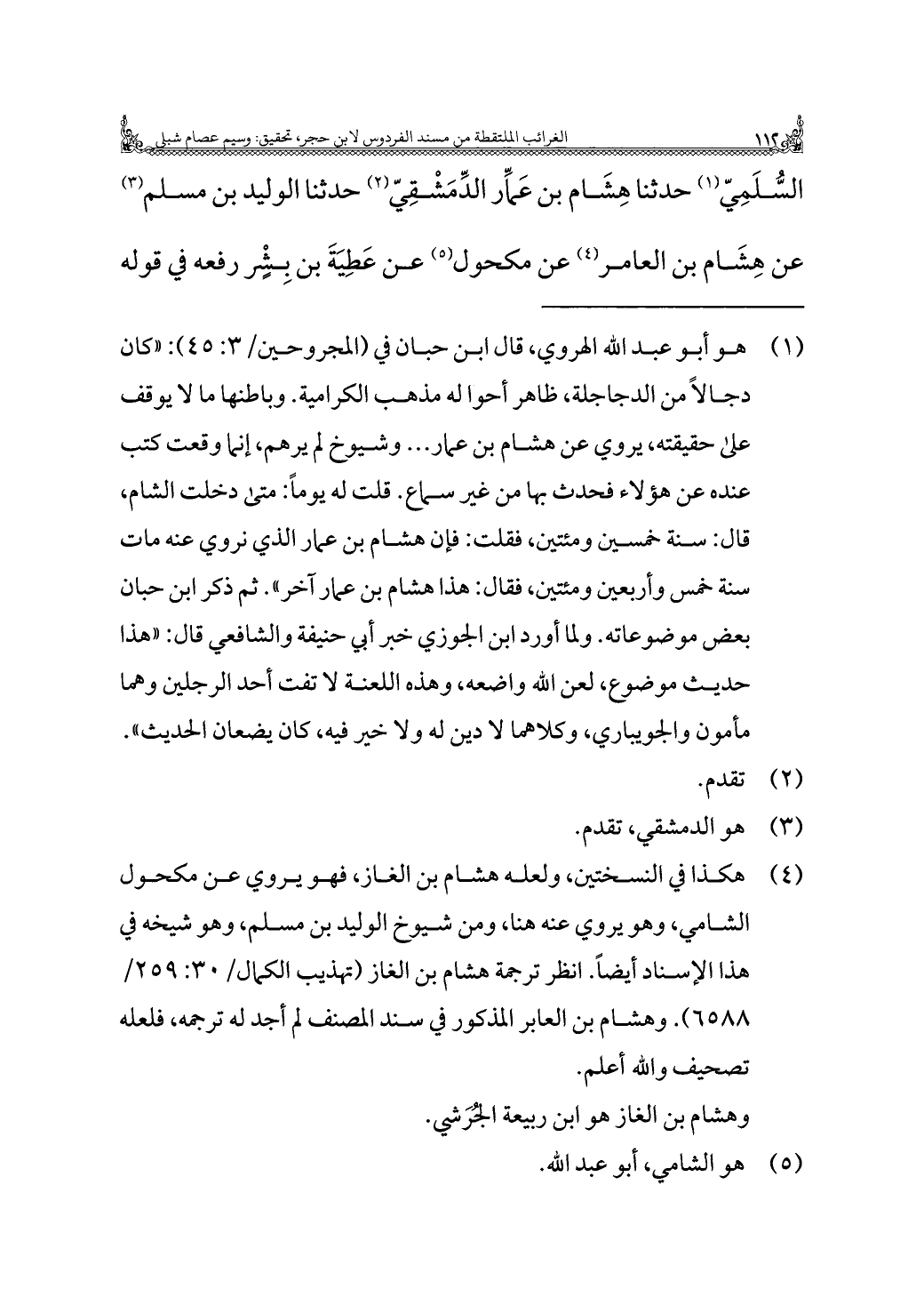 (¬٤) هكذا في النسختين، ولعله هشام بن الغاز، فهو يروي عن مكحول الشامي، وهو يروي عنه هنا، ومن شيوخ الوليد بن مسلم، وهو شيخه في هذا الإسناد أيضًا. انظر ترجمة هشام بن الغاز (تهذيب الكمال/ ٣٠: ٢٥٩/ ٦٥٨٨). وهشام بن العابر المذكور في سند المصنف لم أجد له ترجمه، فلعله تصحيف والله أعلم.
