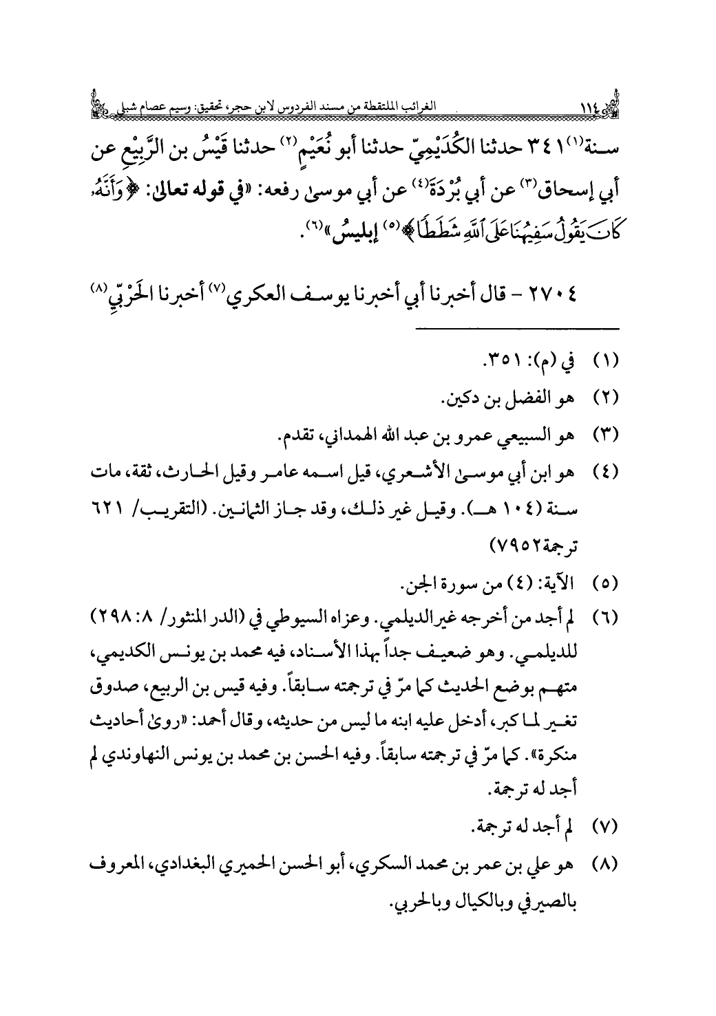 سنة (¬١) ٣٤١ حدثنا الكُدَيْمِيّ حدثنا أبو نُعَيْمٍ (¬٢) حدثنا قَيْسُ بن الرَّبِيْعِ عن أبي إسحاق (¬٣) عن أبي بُرْدَةَ (¬٤) عن أبي موسى رفعه: "في قوله تعالى: {وَأَنَّهُ كَانَ يَقُولُ سَفِيهُنَا عَلَى اللَّهِ شَطَطًا} (¬٥) إبليسُ" (¬٦).