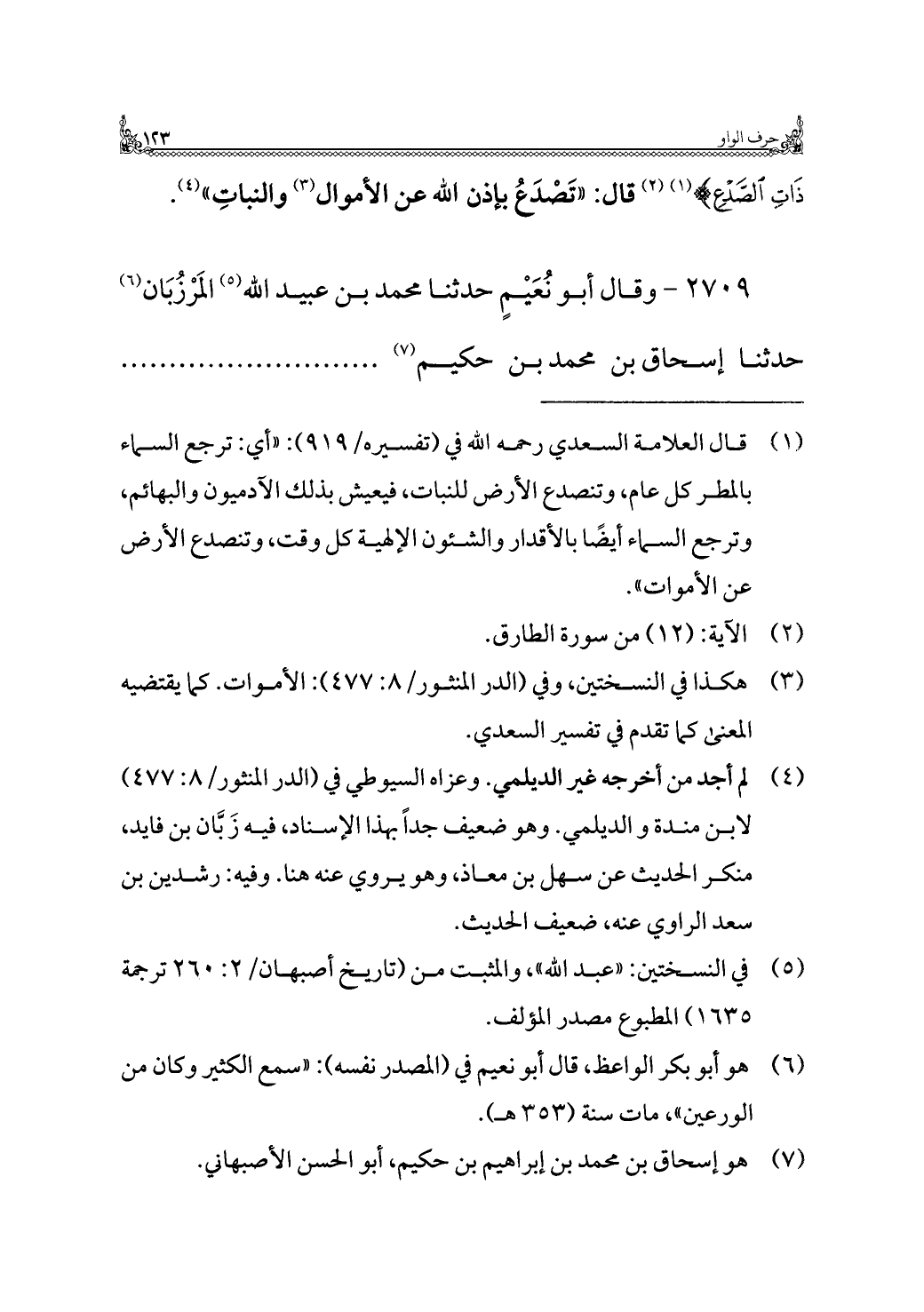 (¬١) قال العلامة السعدي رحمه الله في (تفسيره/ ٩١٩): "أي: ترجع السماء بالمطر كل عام، وتنصدع الأرض للنبات، فيعيش بذلك الآدميون والبهائم، وترجع السماء أيضًا بالأقدار والشئون الإلهية كل وقت، وتنصدع الأرض عن الأموات".