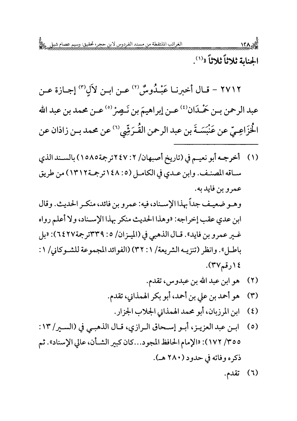 ٢٧١٢ - قال أخبرنا عَبْدُوسٌ (¬٢) عن ابن لَالٍ (¬٣) إجازة عن عبد الرحمن بن حَمْدَان (¬٤) عن إبراهيمَ بن نَصْرٍ (¬٥) عن محمد بن عبد الله الخُزَاعِيّ عن عَنْبَسَةَ بن عبد الرحمن القُرَشِّي (¬٦) عن محمد بن زاذان عن