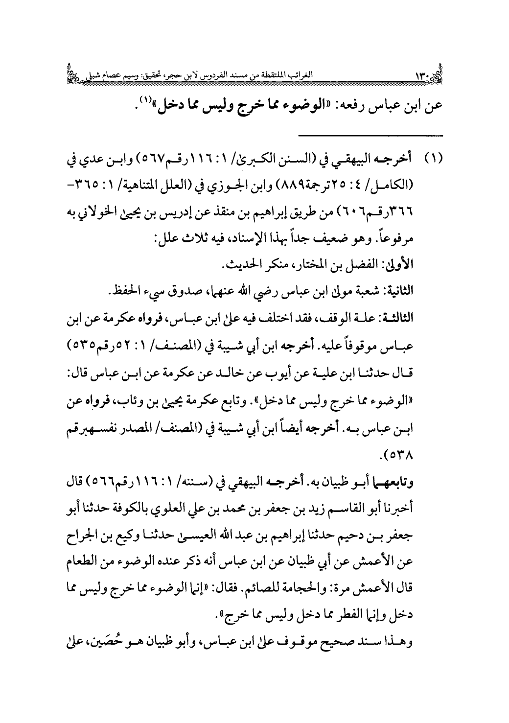 الثالثة: علة الوقف، فقد اختلف فيه على ابن عباس، فرواه عكرمة عن ابن عباس موقوفًا عليه. أخرجه ابن أبي شيبة في (المصنف/ ١: ٥٢ رقم ٥٣٥) قال حدثنا ابن علية عن أيوب عن خالد عن عكرمة عن ابن عباس قال: "الوضوء مما خرج وليس مما دخل". وتابع عكرمة يحيى بن وئاب، فرواه عن ابن عباس به. أخرجه أيضًا ابن أبي شيبة في (المصنف/ المصدر نفسه برقم ٥٣٨).