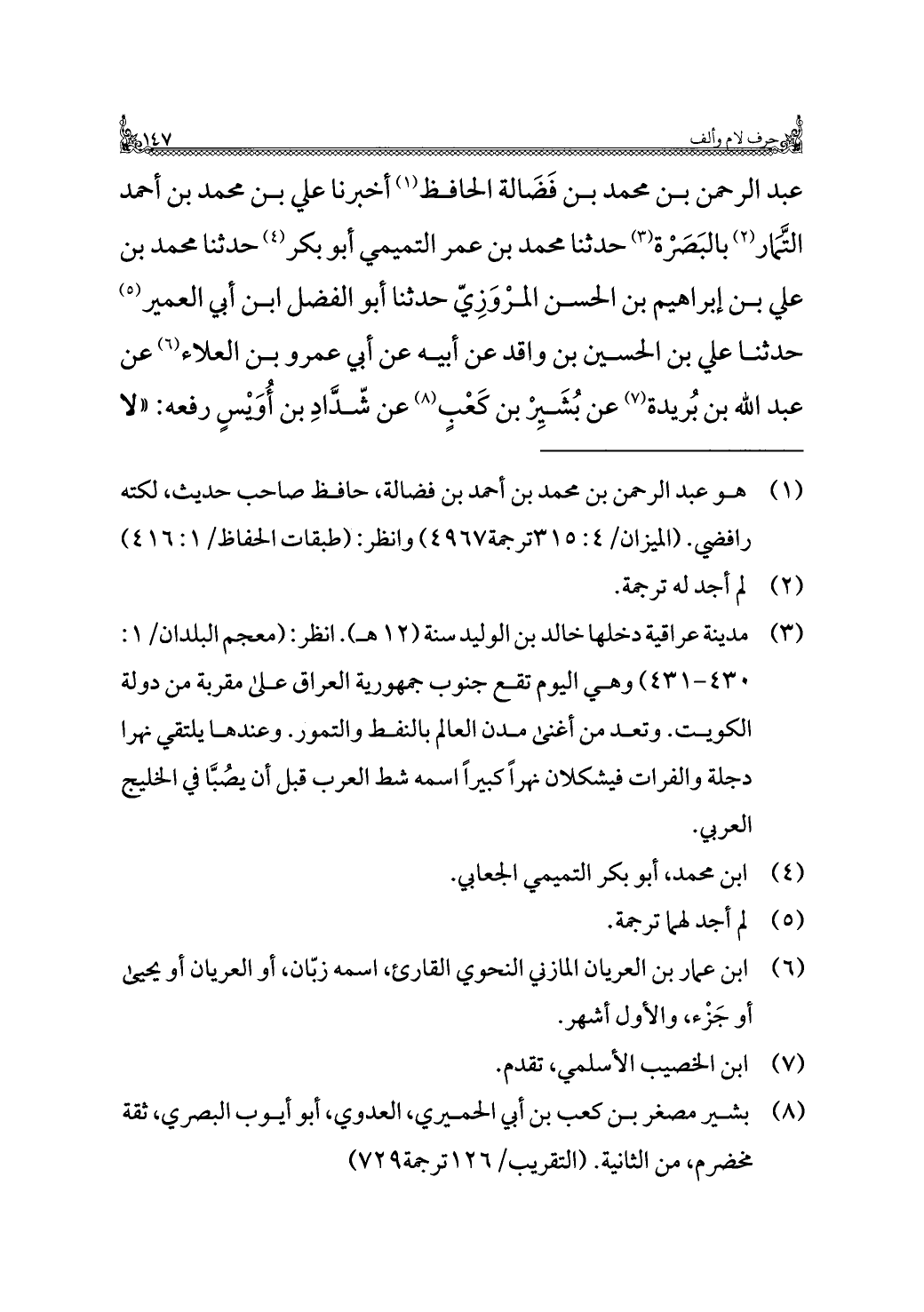 عبد الرحمن بن محمد بن فَضَالة الحافظ (¬١) أخبرنا علي بن محمد بن أحمد التَّمَار (¬٢) بالبَصَرْة (¬٣) حدثنا محمد بن عمر التميمي أبو بكر (¬٤) حدثنا محمد بن علي بن إبراهيم بن الحسن المرْوَزِيّ حدثنا أبو الفضل ابن أبي العمير (¬٥) حدثنا علي بن الحسين بن واقد عن أبيه عن أبي عمرو بن العلاء (¬٦) عن عبد الله بن بُريدة (¬٧) عن بُشَيِرْ بن كَعْبٍ (¬٨) عن شّدَّادِ بن أُوَيْسٍ رفعه: "لا