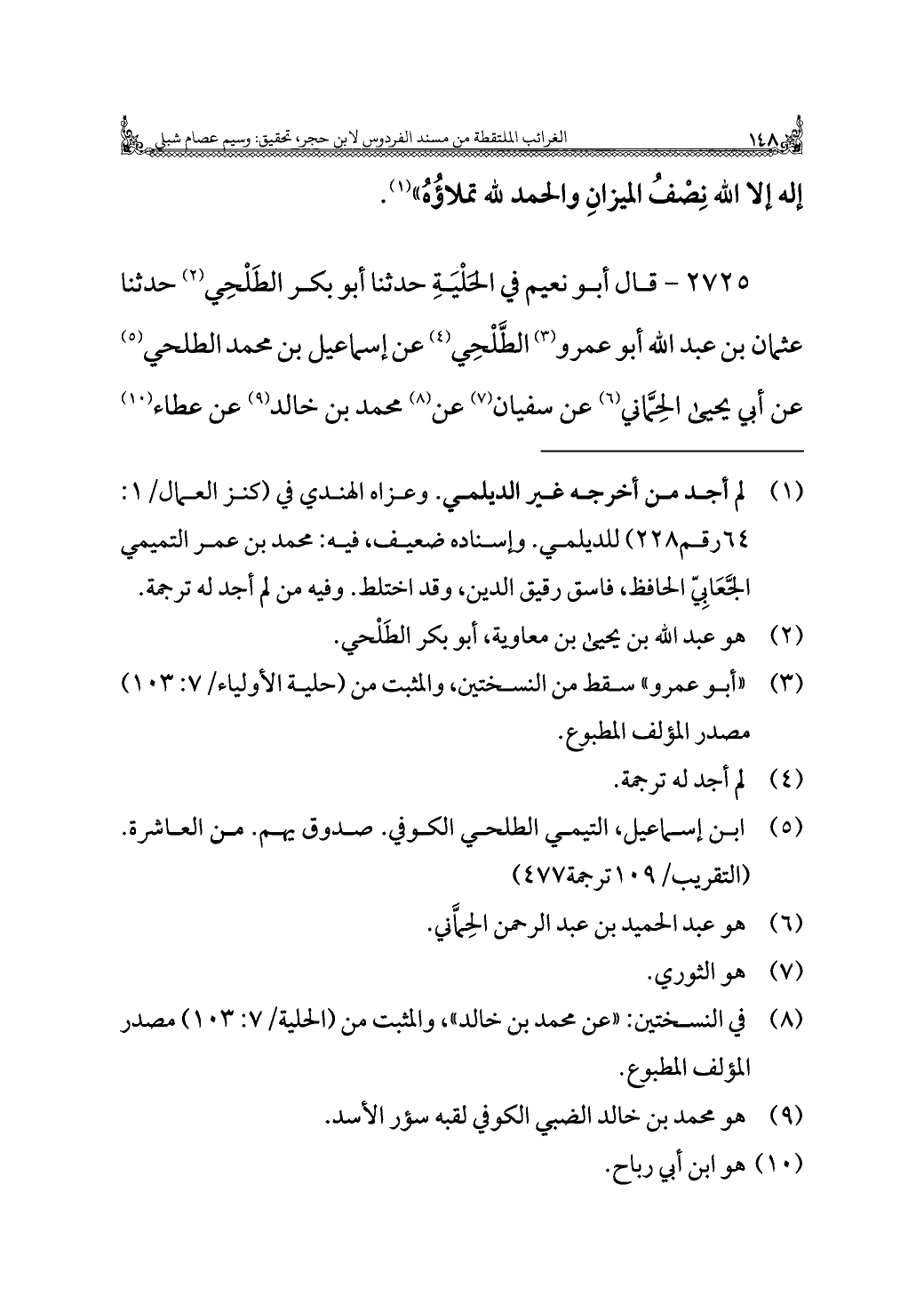 ٢٧٢٥ - قال أبو نعيم في الحَلْيَةِ حدثنا أبو بكر الطَلْحِي (¬٢) حدثنا عثمان بن عبد الله أبو عمرو (¬٣) الطَّلْحِي (¬٤) عن إسماعيل بن محمد الطلحي (¬٥) عن أبي يحيى الحِمَّاني (¬٦) عن سفيان (¬٧) عن (¬٨) محمد بن خالد (¬٩) عن عطاء (¬١٠)
