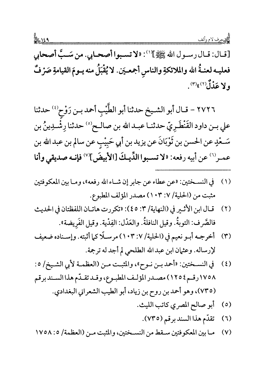 (¬٤) في النسختين: "أحمد بن نوح"، والمثبت من (العظمة لأبي الشيخ/ ٥: ١٧٥٨ رقم ١٢٥٤) مصدر المؤلف المطبوع، وقد تقدّم هذا السند برقم (٧٣٥)، وهو أحمد بن روح بن زياد، أبو الطيب الشعراني البغدادي.