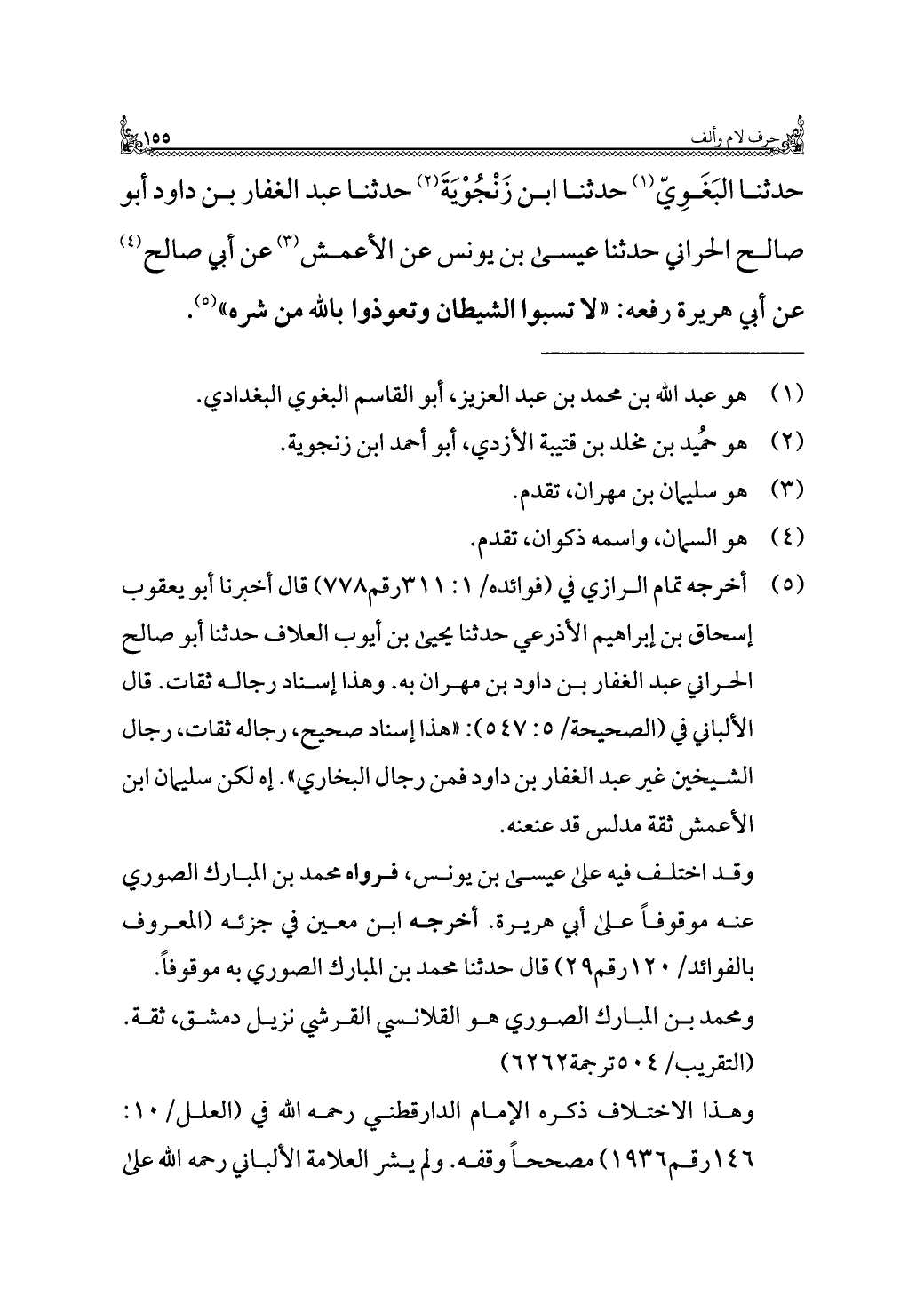 حدثنا البَغَوِيّ (¬١) حدثنا ابن زَنْجُوْيَةَ (¬٢) حدثنا عبد الغفار بن داود أبو صالح الحراني حدثنا عيسى بن يونس عن الأعمش (¬٣) عن أبي صالح (¬٤) عن أبي هريرة رفعه: "لا تسبوا الشيطان وتعوذوا بالله من شره" (¬٥).