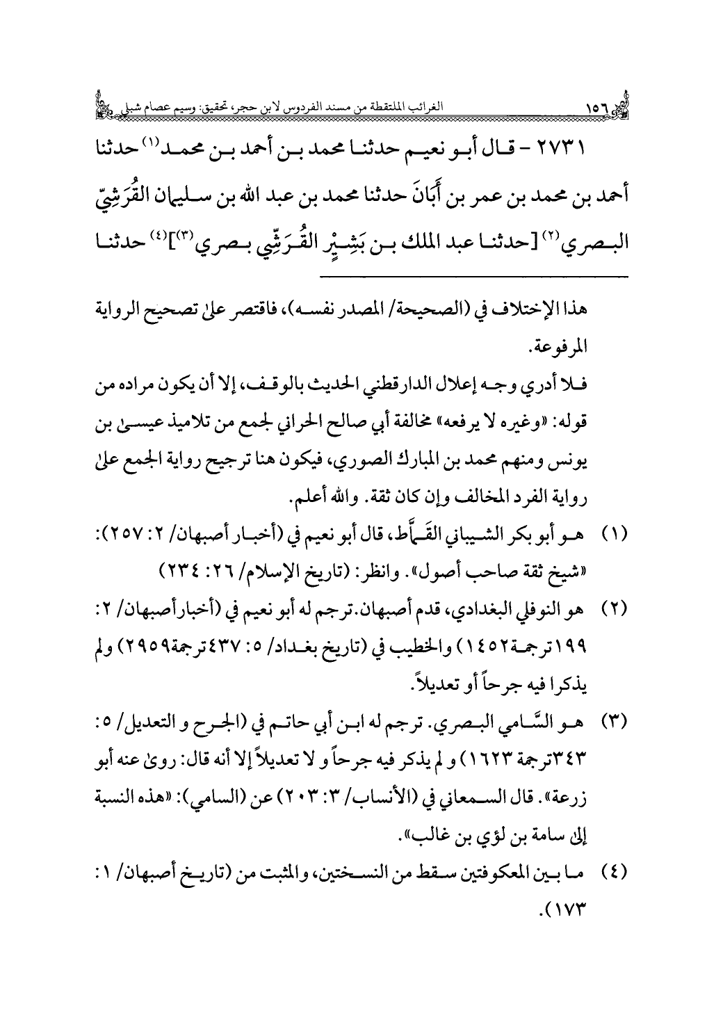 (¬٢) هو النوفلي البغدادي، قدم أصبهان. ترجم له أبو نعيم في (أخبار أصبهان/ ٢: ١٩٩ ترجمة ١٤٥٢) والخطيب في (تاريخ بغداد/ ٥: ٤٣٧ ترجمة ٢٩٥٩) ولم يذكرا فيه جرحًا أو تعديلًا.