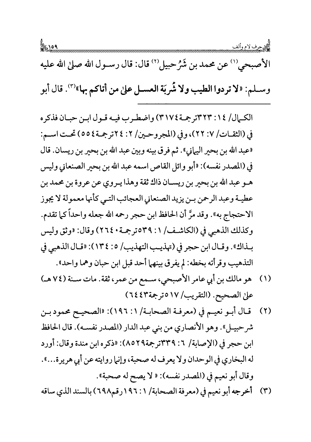 الكمال / ١٤: ٣٢٣ ترجمة ٣١٧٤) واضطرب فيه قول ابن حبان فذكره في (الثقات/ ٧: ٢٢)، وفي (المجروحين/ ٢: ٢٤ ترجمة ٥٥٤) تحت اسم: "عبد الله بن بحير اليماني". ثم فرق بينه وبين عبد الله بن بحير بن ريسان. قال في (المصدر نفسه): "أبو وائل القاص اسمه عبد الله بن بحير الصنعاني وليس هو عبد الله بن بحير بن ريسان ذاك ثقة وهذا يروي عن عروة بن محمد بن عطية وعبد الرحمن بن يزيد الصنعاني العجائب التي كأنها معمولة لا يجوز الاحتجاج به". وقد مرَّ أن الحافظ ابن حجر رحمه الله جعله واحدًا كما تقدم. وكذلك الذهبي في (الكاشف/ ١: ٥٣٩ ترجمة ٢٦٤٠) وقال: "وثق وليس بذاك". وقال ابن حجر في (تهذيب التهذيب/ ٥: ١٣٤): "قال الذهبي في التذهيب وقرأته بخطه: لم يفرق بينهما أحد قبل ابن حبان وهما واحد".