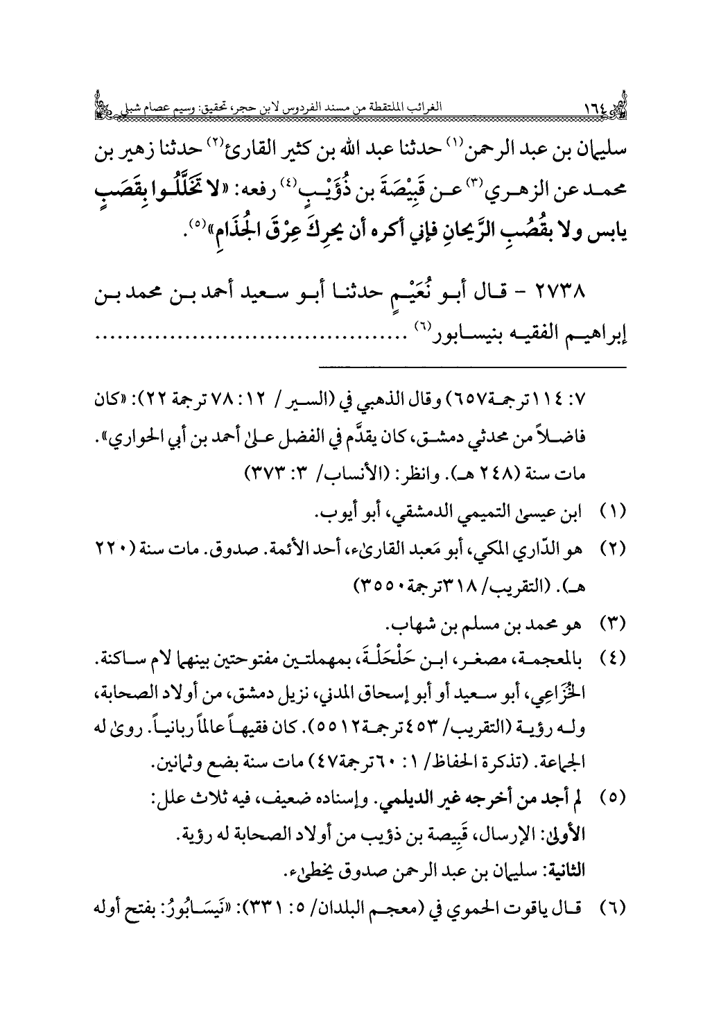سليمان بن عبد الرحمن (¬١) حدثنا عبد الله بن كثير القارئ (¬٢) حدثنا زهير بن محمد عن الزهري (¬٣) عن قَبِيْصَةَ بن ذُؤَيْبٍ (¬٤) رفعه: "لا تخَلَّلُوا بِقَصَبٍ يابس ولا بقُصُبِ الرَّيحانِ فإني أكره أن يحرِكَ عِرْقَ الجُذَامِ" (¬٥).