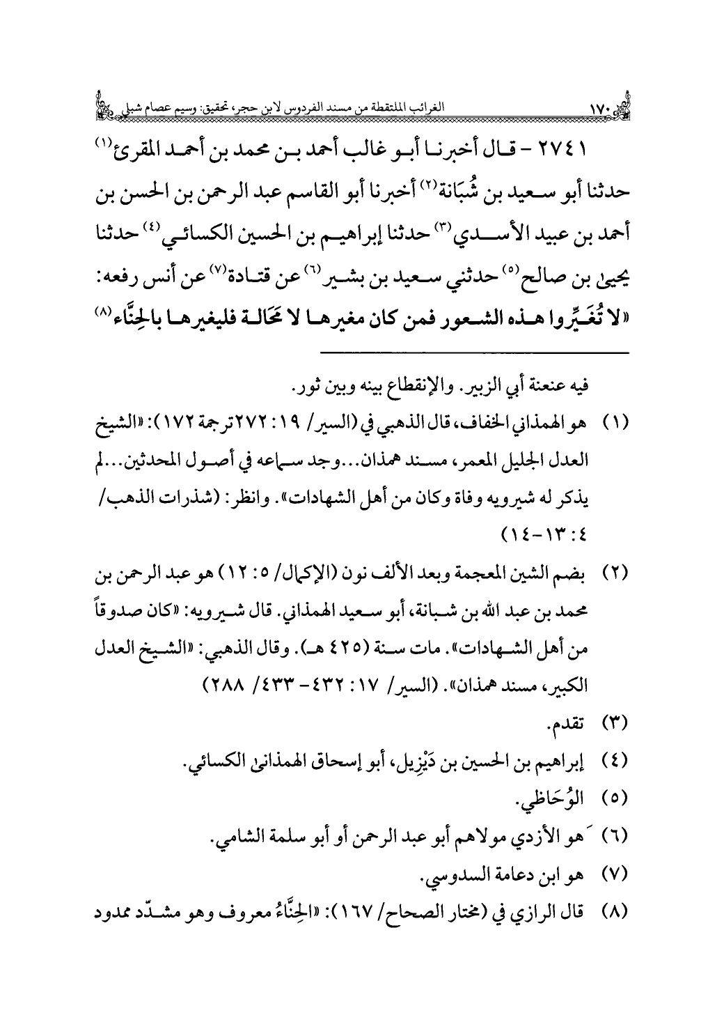 ٢٧٤١ - قال أخبرنا أبو غالب أحمد بن محمد بن أحمد المقرئ (¬١) حدثنا أبو سعيد بن شُبَانة (¬٢) أخبرنا أبو القاسم عبد الرحمن بن الحسن بن أحمد بن عبيد الأسدي (¬٣) حدثنا إبراهيم بن الحسين الكسائي (¬٤) حدثنا يحيى بن صالح (¬٥) حدثني سعيد بن بشير (¬٦) عن قتادة (¬٧) عن أنس رفعه: "لا تُغَيِّروا هذه الشعور فمن كان مغيرها لا مَحَالة فليغيرها بالحِنَّاء (¬٨)