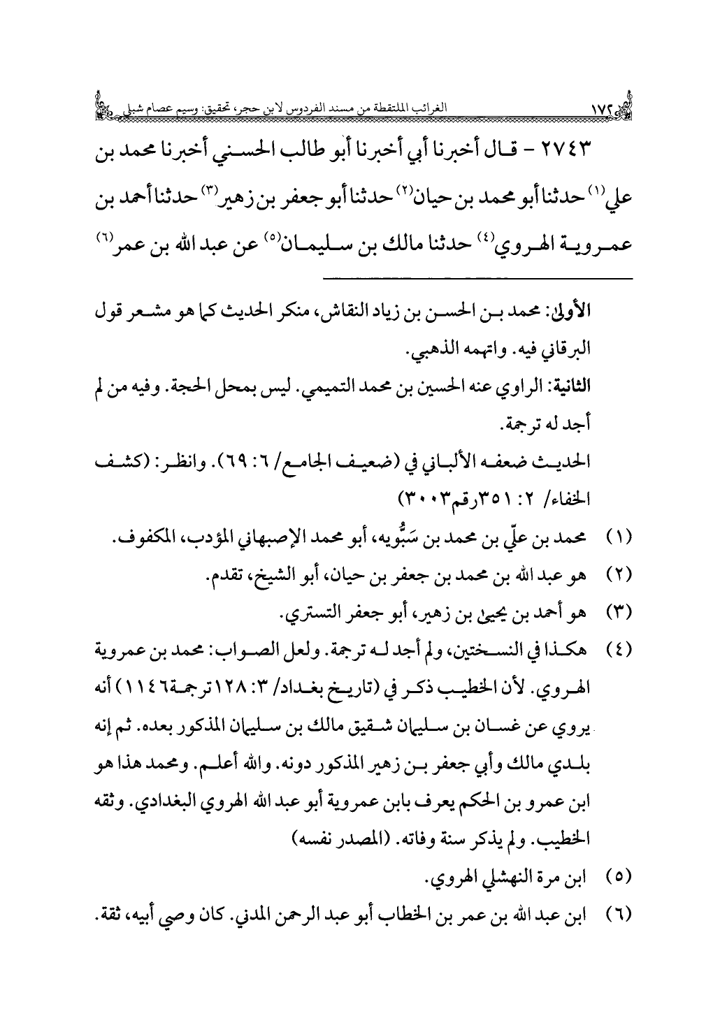 ٢٧٤٣ - قال أخبرنا أبي أخبرنا أبو طالب الحسني أخبرنا محمد بن علي (¬١) حدثنا أبو محمد بن حيان (¬٢) حدثنا أبو جعفر بن زهير (¬٣) حدثنا أحمد بن عمروية الهروي (¬٤) حدثنا مالك بن سليمان (¬٥) عن عبد الله بن عمر (¬٦)