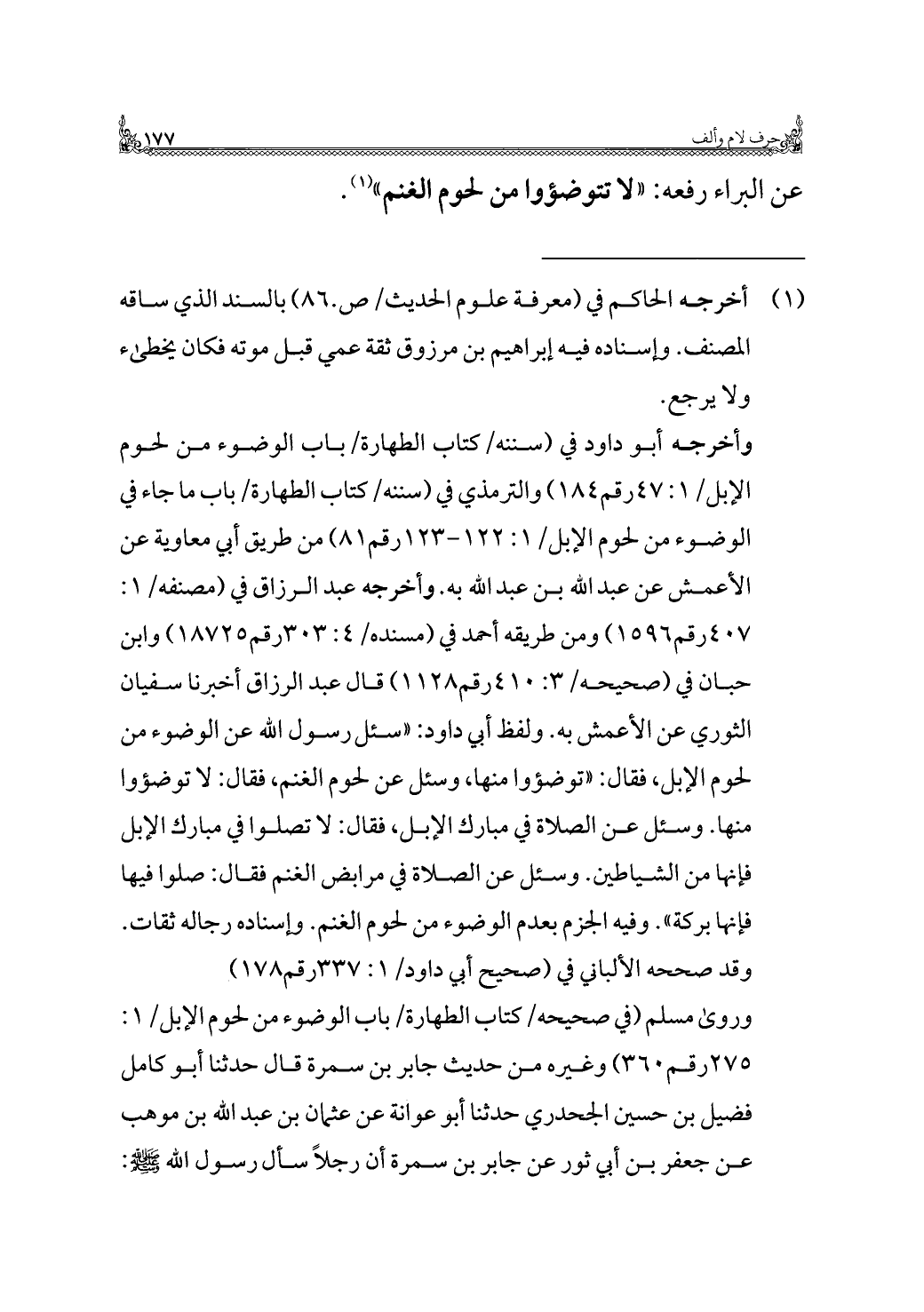 وروى مسلم (في صحيحه/ كتاب الطهارة/ باب الوضوء من لحوم الإبل/ ١: ٢٧٥ رقم ٣٦٠) وغيره من حديث جابر بن سمرة قال حدثنا أبو كامل فضيل بن حسين الجحدري حدثنا أبو عوانة عن عثمان بن عبد الله بن موهب عن جعفر بن أبي ثور عن جابر بن سمرة أن رجلًا سأل رسول الله - صلى الله عليه وسلم -: =