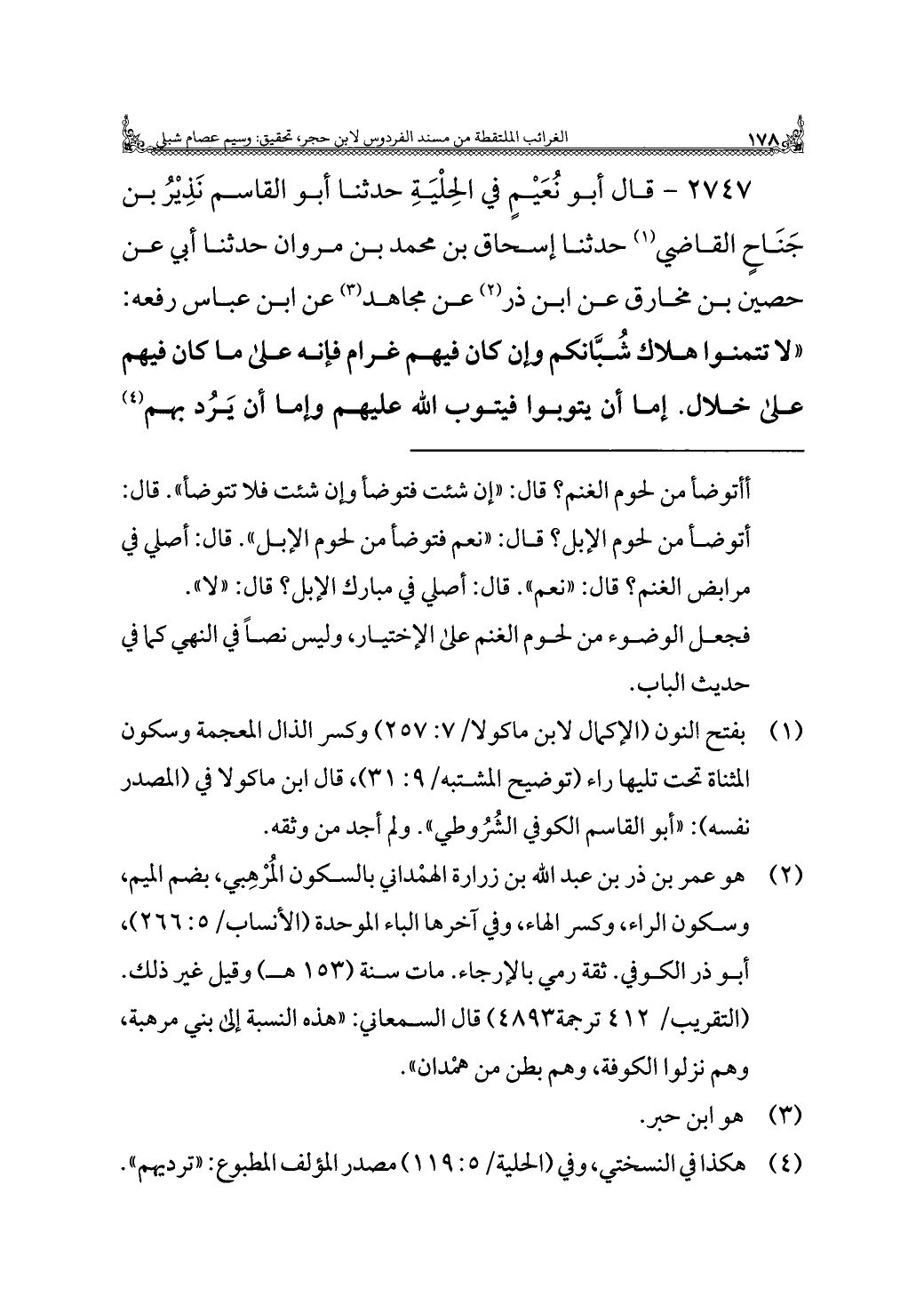 ٢٧٤٧ - قال أبو نُعَيْمٍ في الحِلْيَةِ حدثنا أبو القاسم نَذِيْرُ بن جَنَاحٍ القاضي (¬١) حدثنا إسحاق بن محمد بن مروان حدثنا أبي عن حصين بن مخارق عن ابن ذر (¬٢) عن مجاهد (¬٣) عن ابن عباس رفعه: "لا تتمنوا هلاك شُبَّانكم وإن كان فيهم غرام فإنه على ما كان فيهم على خلال. إما أن يتوبوا فيتوب الله عليهم وإما أن يَرُد بهم (¬٤)