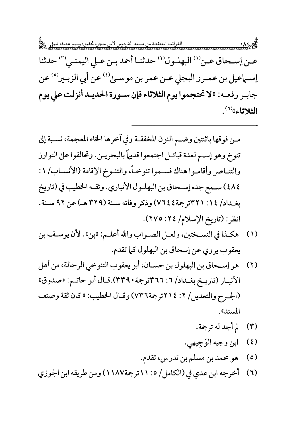 عن إسحاق عن (¬١) البهلول (¬٢) حدثنا أحمد بن علي اليمني (¬٣) حدثنا إسماعيل بن عمرو البجلي عن عمر بن موسى (¬٤) عن أبي الزبير (¬٥) عن جابر رفعه: "لا تحتجموا يوم الثلاثاء فإن سورة الحديد أنزلت علي يوم الثلاثاء" (¬٦).