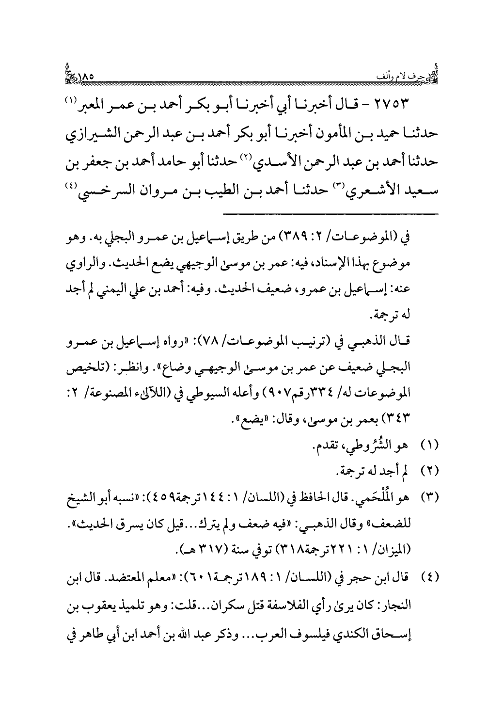 (¬٣) هو المُلْحَمي. قال الحافظ في (اللسان/ ١: ١٤٤ ترجمة ٤٥٩): "نسبه أبو الشيخ للضعف" وقال الذهبي: "فيه ضعف ولم يترك ... قيل كان يسرق الحديث". (الميزان/ ١: ٢٢١ ترجمة ٣١٨) توفي سنة (٣١٧ هـ).