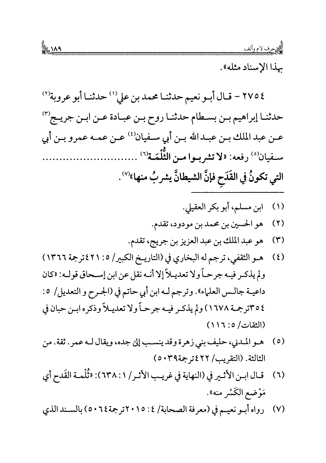 ٢٧٥٤ - قال أبو نعيم حدثنا محمد بن علي (¬١) حدثنا أبو عروبة (¬٢) حدثنا إبراهيم بن بسطام حدثنا روح بن عبادة عن ابن جريج (¬٣) عن عبد الملك بن عبد الله بن أبي سفيان (¬٤) عن عمه عمرو بن أبي سفيان (¬٥) رفعه: "لا تشربوا من الثُّلْمَة (¬٦) ............................ التي تكونُ في القَدَحَ فإنَّ الشيطان يشربُ منها" (¬٧).