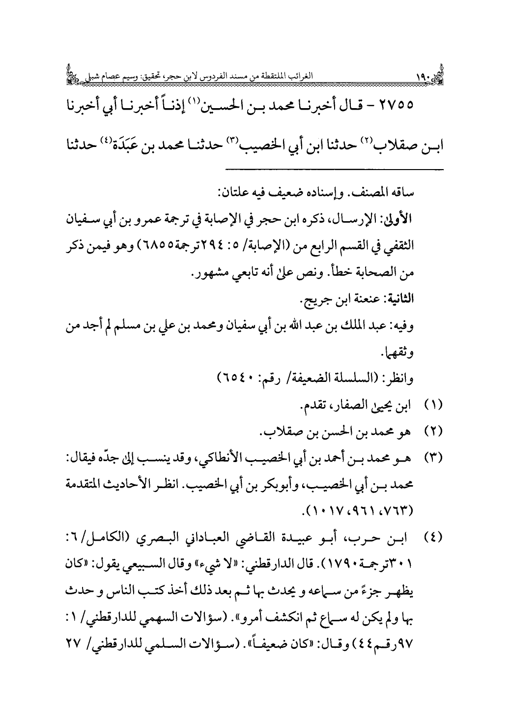(¬٤) ابن حرب، أبو عبيدة القاضي العباداني البصري (الكامل/ ٦: ٣٠١ ترجمة ١٧٩٠). قال الدارقطني: "لا شيء" وقال السبيعي يقول: "كان يظهر جزءً من سماعه ويحدث بها ثم بعد ذلك أخذ كتب الناس وحدث بها ولم يكن له سماع ثم انكشف أمرو". (سؤالات السهمي للدارقطني/ ١: ٩٧ رقم ٤٤) وقال: "كان ضعيفًا". (سؤالات السلمي للدارقطني/ ٢٧ =