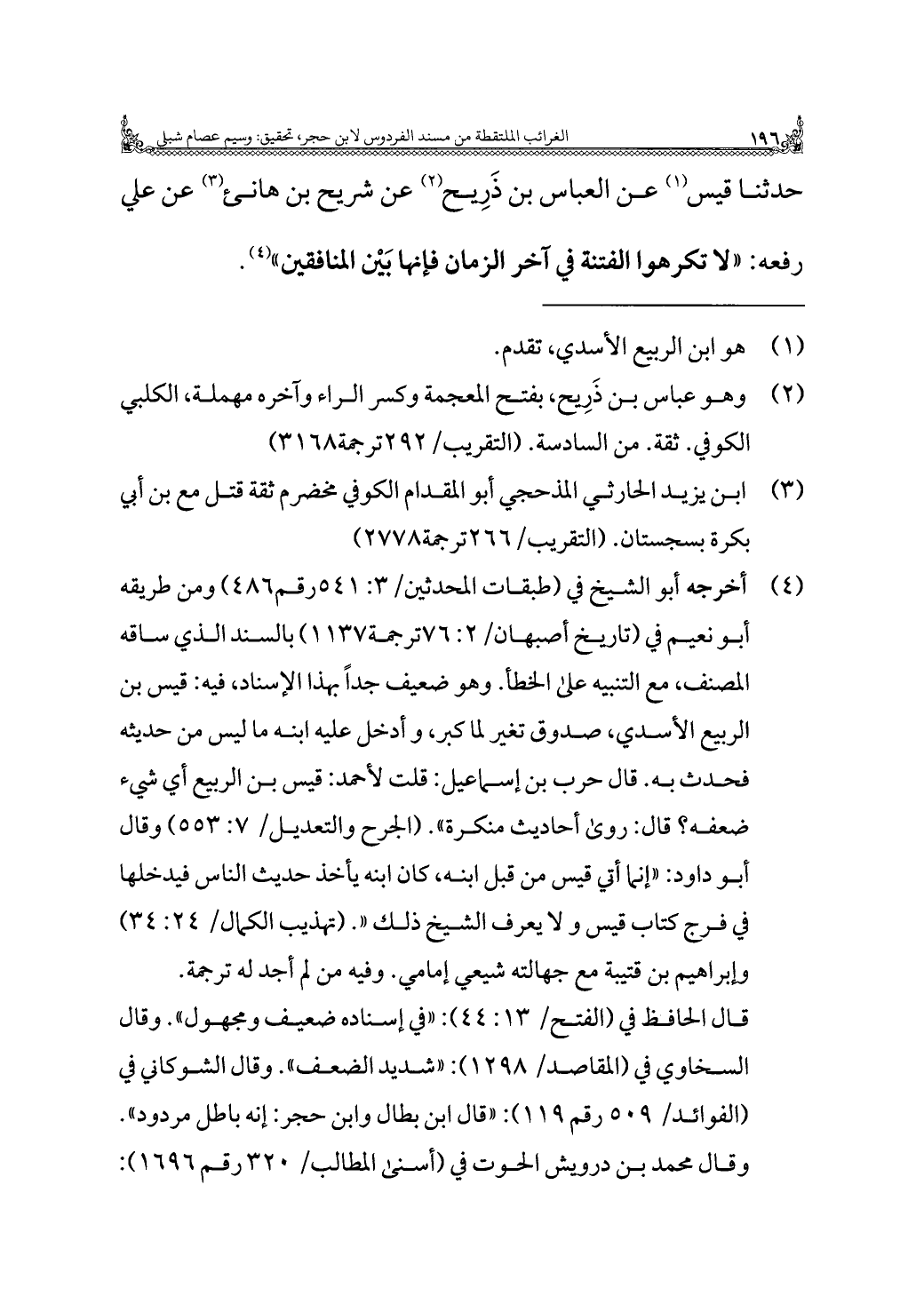 حدثنا قيس (¬١) عن العباس بن ذَرِيح (¬٢) عن شريح بن هانئ (¬٣) عن علي رفعه: "لا تكرهوا الفتنة في آخر الزمان فإنها بَيْن المنافقين" (¬٤).