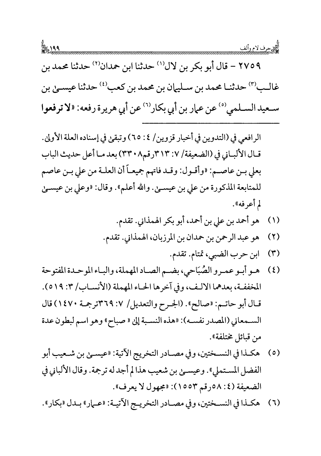 ٢٧٥٩ - قال أبو بكر بن قال (¬١) حدثنا ابن حمدان (¬٢) حدثنا محمد بن غالب (¬٣) حدثنا محمد بن سليمان بن محمد بن كعب (¬٤) حدثنا عيسى بن سعيد السلمي (¬٥) عن عمار بن أبي بكار (¬٦) عن أبي هريرة رفعه: "لا ترفعوا