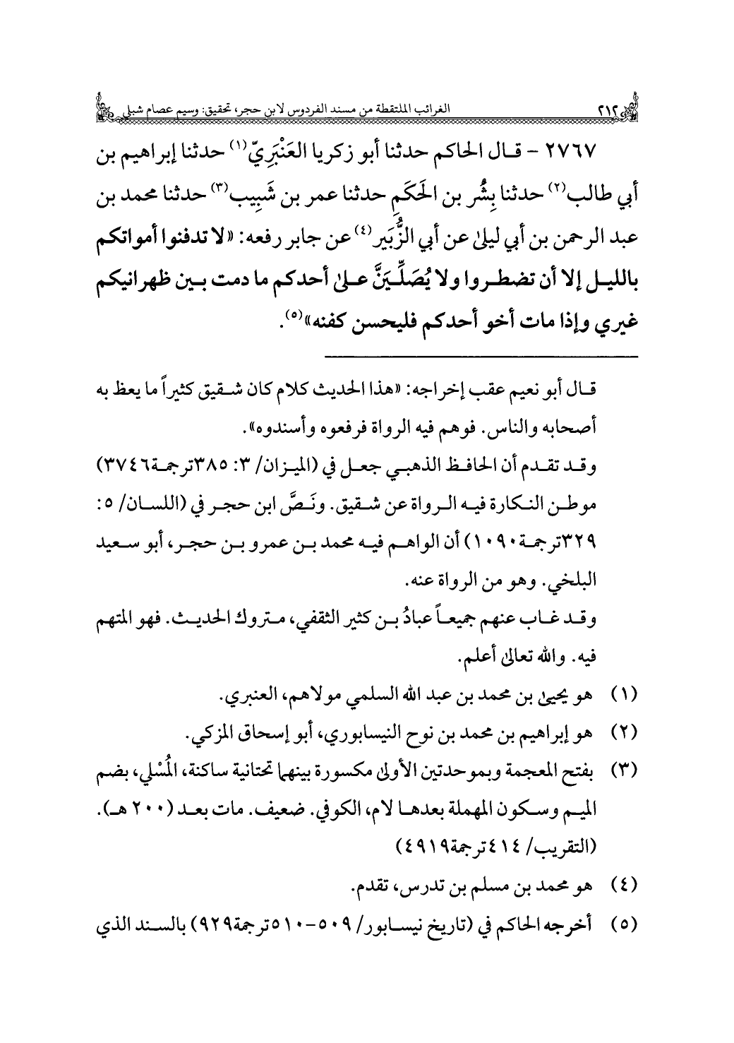 ٢٧٦٧ - قال الحاكم حدثنا أبو زكريا العَنْبَرِيّ (¬١) حدثنا إبراهيم بن أبي طالب (¬٢) حدثنا بِشُر بن الحَكَمِ حدثنا عمر بن شَبِيب (¬٣) حدثنا محمد بن عبد الرحمن بن أبي ليلى عن أبي الزُّبَير (¬٤) عن جابر رفعه: "لا تدفنوا أمواتكم بالليل إلا أن تضطروا ولا يُصَلِّيَنَّ على أحدكم ما دمت بين ظهرانيكم غيري وإذا مات أخو أحدكم فليحسن كفنه" (¬٥).