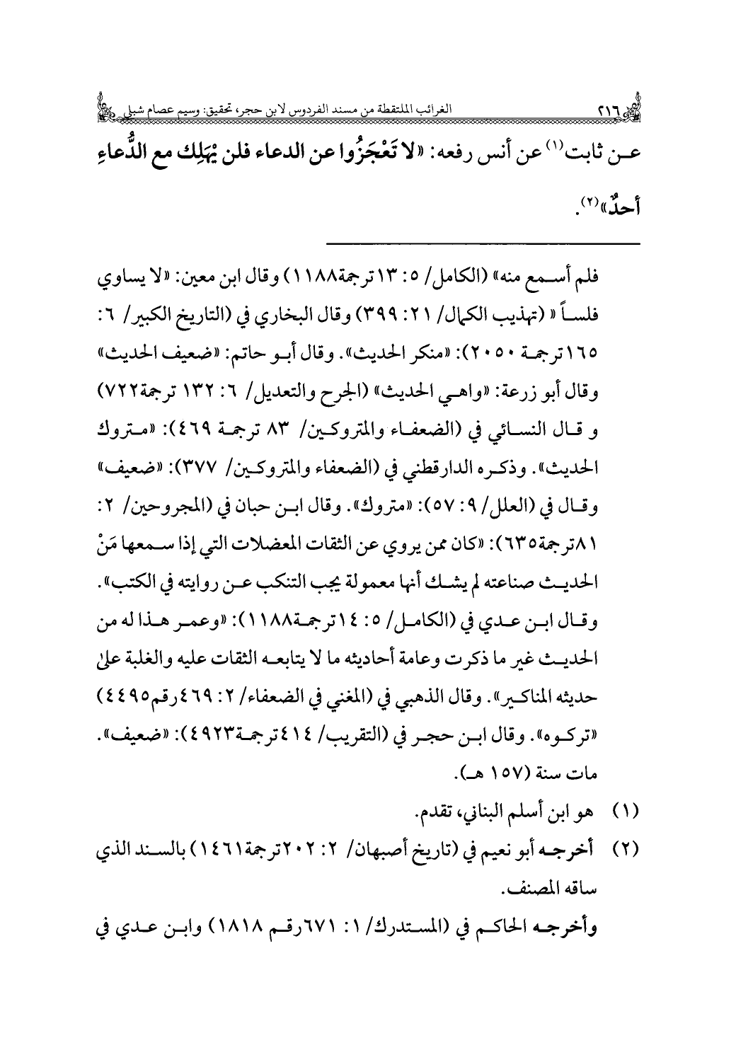 عن ثابت (¬١) عن أنس رفعه: "لا تَعْجَزُوا عن الدعاء فلن يْهَلِك مع الدُّعاءِ أحدٌ" (¬٢).