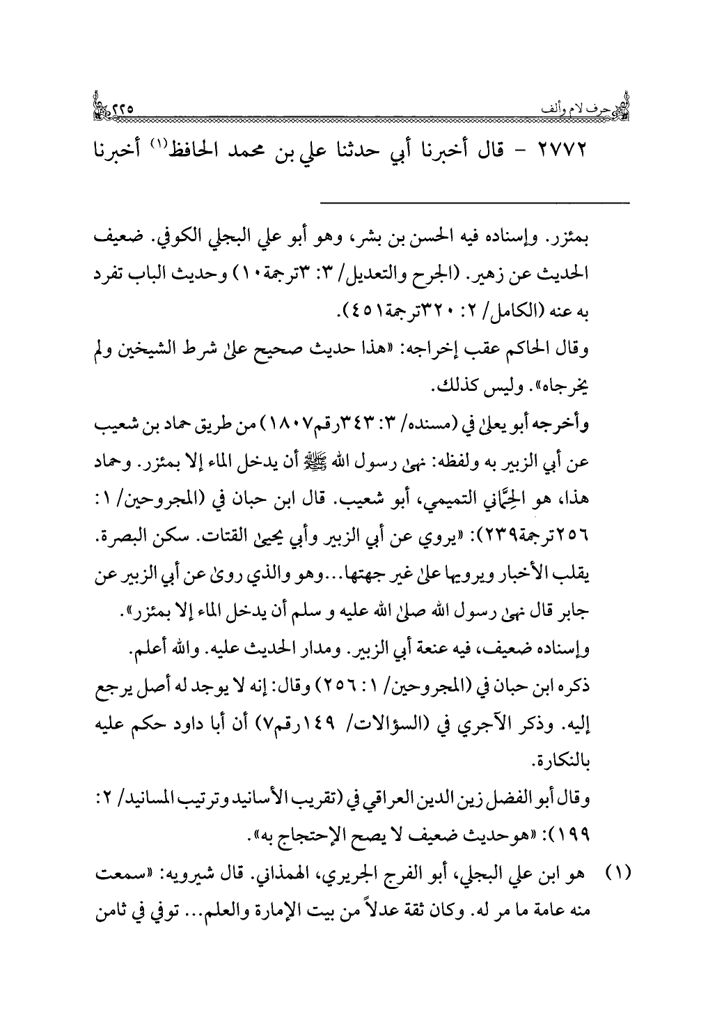 وأخرجه أبو يعلى في (مسنده/ ٣: ٣٤٣ رقم ١٨٠٧) من طريق حماد بن شعيب عن أبي الزبير به ولفظه: نهى رسول الله - صلى الله عليه وسلم - أن يدخل الماء إلا بمئزر. وحماد هذا، هو الحِمَّاني التميمي، أبو شعيب. قال ابن حبان في (المجروحين/ ١: ٢٥٦ ترجمة ٢٣٩): "يروي عن أبي الزبير وأبي يحيى القتات. سكن البصرة. يقلب الأخبار ويرويها على غير جهتها ... وهو والذي روى عن أبي الزبير عن جابر قال نهى رسول الله صلى الله عليه وسلم أن يدخل الماء إلا بمئزر".