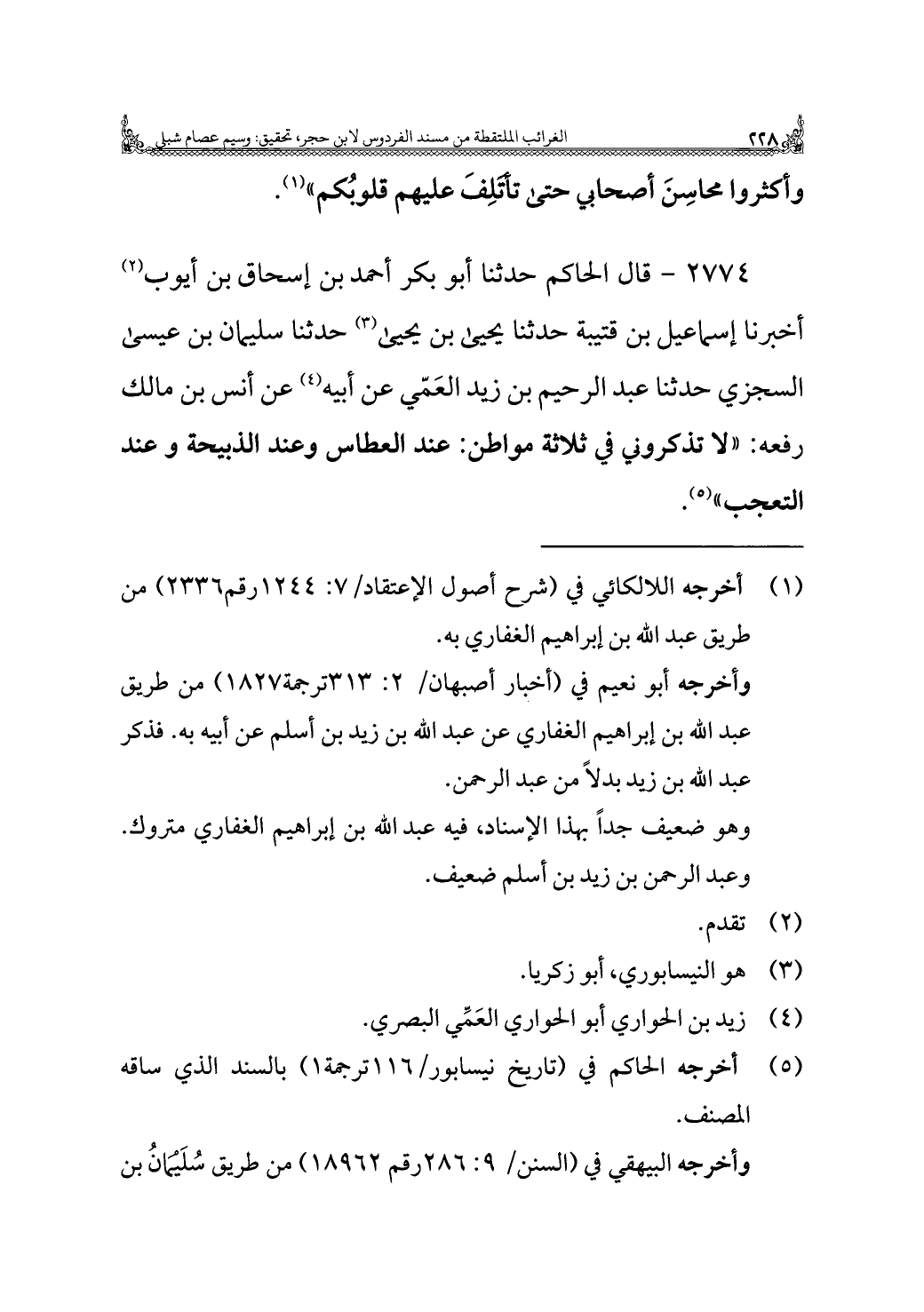 ٢٧٧٤ - قال الحاكم حدثنا أبو بكر أحمد بن إسحاق بن أيوب (¬٢) أخبرنا إسماعيل بن قتيبة حدثنا يحيى بن يحيى (¬٣) حدثنا سليمان بن عيسى السجزي حدثنا عبد الرحيم بن زيد العَمّي عن أبيه (¬٤) عن أنس بن مالك رفعه: "لا تذكروني في ثلاثة مواطن: عند العطاس وعند الذبيحة وعند التعجب" (¬٥).