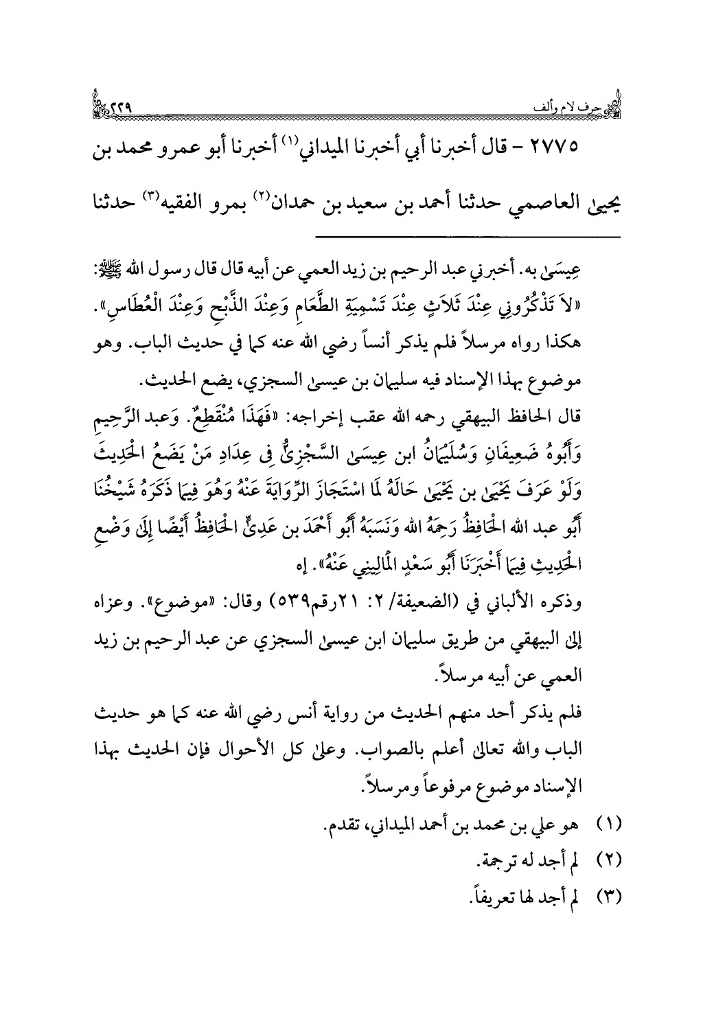 = عِيسَى به. أخبرني عبد الرحيم بن زيد العمي عن أبيه قال قال رسول الله - صلى الله عليه وسلم -: "لَا تَذْكُرُونِي عِنْدَ ثَلَاثٍ عِنْدَ تَسْمِيَةِ الطَّعَامِ وَعِنْدَ الذَّبْحِ وَعِنْدَ الْعُطَاسِ". هكذا رواه مرسلًا فلم يذكر أنسًا رضي الله عنه كما في حديث الباب. وهو موضوع بهذا الإسناد فيه سليمان بن عيسى السجزي، يضع الحديث.